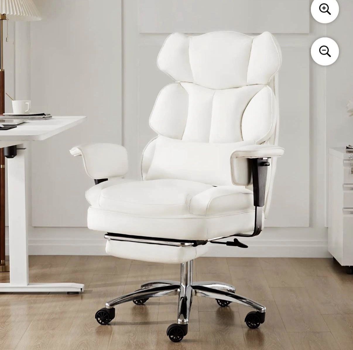 New just assembled ready to go Executive Home Office Desk Chair Ergonomic Big Tall High Back with Footrest & Lumbar Support, Reclining Height Adjustable Comfy PU Leather Computer Gaming with Swivel Wheels, White
