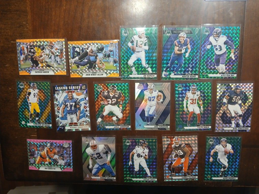 I have this 16 football cards for sale fresh pulls nothing crazy no big names just nices cards im not looking I want $16 firm firm firm offers will be ignored 2 orange silver mosaic parallels bases 8 green silver mosaic bases 2 silver mosaic bases 1 pink silver mosaic base 2 silver bases 1 holo silver parallel insert