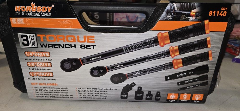Brand New Horusdy 3Pc Torque Wrench Set, 1/4", 3/8", 1/2" Drive Click Torque Wrench Extra with Extension Bars & Adapters, Dual-Direction Adjustable Precision Torque Wrenches for Car, Motorcycle, Bike DIY Maintenance $75 PICK UP ONLY🚶♂️🚶♀️ CASH ONLY💰💵 90TH CICERO AVENUE🚦🛑
