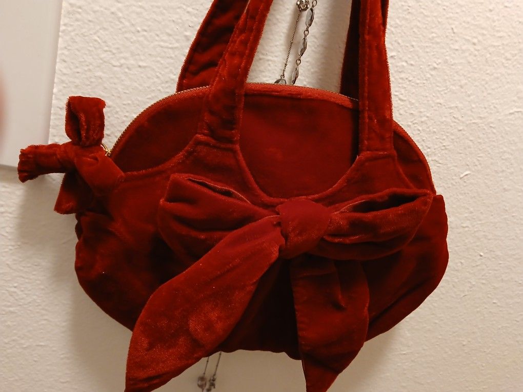 Double bow crushed red velvet with multiple pockets throught. Light weight purse, double strap, zip across closure. New condition.