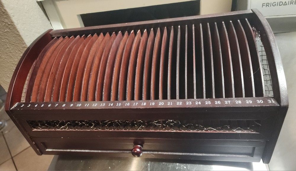 Monthly bill Wooden 31 + slotted calendar table top organizer with drawer.Bills, letters ,C D organizer. Desktop mail organizer, 16 " long 7 1/4"wide, 7" tall. All wood .Brownish red color. Vintage, uses, nice wood tray organizer. Very nice . Good condition. Asking $15 obo