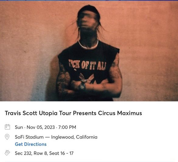 I am selling two tickets for the Travis Scott concert on November 5, 2023. Price is negotiable. I can meet in person for the transfer of tickets! Feel free to message me if you have any questions. Travis Scott Soft Nov 5th Sofi Stadium Price is for the pair Section 232 row 8 Tickets in hand (mobile transfer)