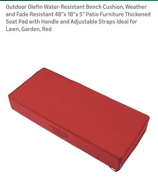 This is a brand new outdoor bench cushion. Never been used. Took out of package and too big for my bench. It is 48x18x5inches. It has tie straps.