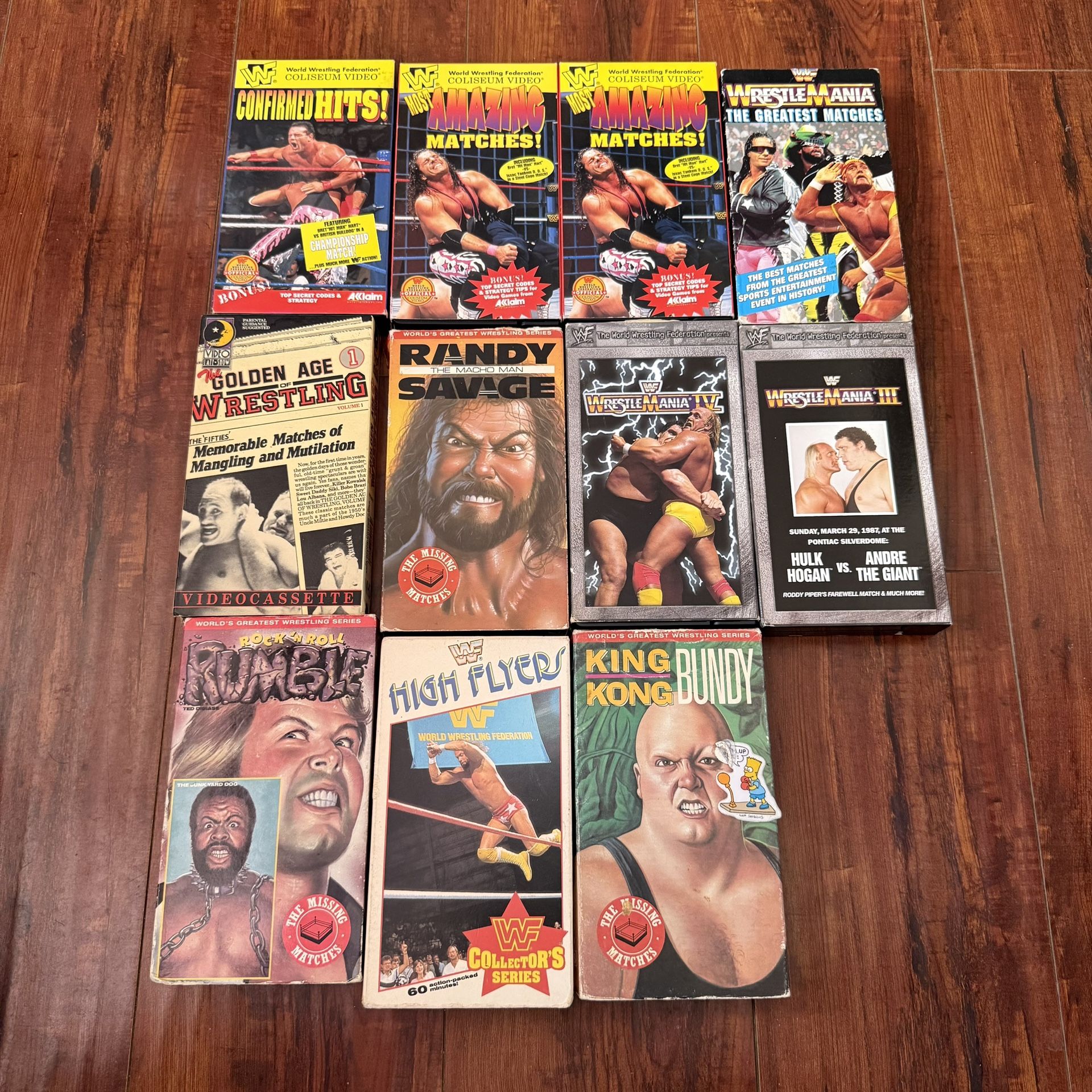 Lot of 11-Vintage WWF/WWE Wrestling VHS Tapes 80,90’s-2000 Era UNTESTED Read Blw Not separating only selling together 7-10 overall condition of the tapes the tapes are still in nice condition. The covers are in nice condition Some covers holders are in nicer condition than others The VHS tapes are in nice condition no brakes or cracks All tapes are untested. Do not have a VHS to test out hopefully are working. Very nice said to add to your collection 11. Total tapes. 2-WWF most amazing matches,WWF confirm hits, wrestlemania, greatest matches, wrestlemania 3, King Kong Bundy, the missing matches-WWF high flyers collector series, rock ‘n’ roll rumble-wrestlemania 4-the golden age of wrestling volume one-Randy, the macho man Savage the missing matches Total weight is about 4 lbs. 6 oz. Please see photos for condition Pick up in Anaheim only public place Thank you take care