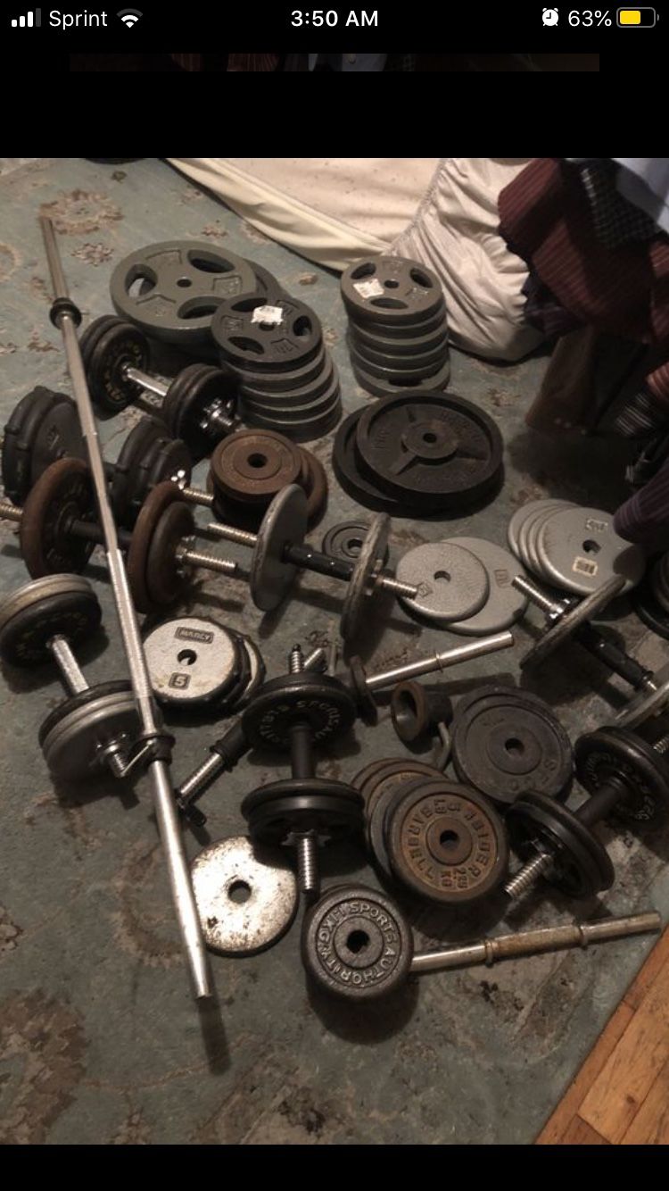 Need gone ASAP 14-25lb 8-10lb 48-5lb 64-2.5lb Dumbbell handles $18 each Dumbbell prices: Weight set offers $2/lb discount if you buy more. Selling 200lb plates for $310 check other posts Bumper weights: Bumper weights 2-35lb discount $175 pair Other sizes vary 2-55lb hulk fitness (blue) 2-25lb extreme fitness 2-25lb raw 2-10 XPRT 45lb X Mark 20kg plate 35lb hi temp Small weight dumbbells In other posts In the pic I have good size in other posts I have other stuff I can build dumbbells 50lb each dumbbell for other posts Handles separate $40 Total $200 $2/lb good condition weights So many weights I have to sell them all before the week ends m pick up in Azusa or I can deliver along 10 or 210 freeways Adjustable dumbbells tell me what size you want I can build any dumbbell size you want 2-50lb plates $140 and get more weights Buy any weights you want Prices for Bars are depending on size and quality I also have many bumper weights new and used variable pricing not $1.5/lb 6-45lb new $230/pair 2-35lb $185 2-25lb bumper plates new $160 2-15lb 4-10lb 6-10lb used $70/pair 2-15lb used $115/pair Also have new and used Olympic bars 7ft barbells used $160 and new $190 Also have slam balls and medicine balls Kettlebells CrossFit gym equipment