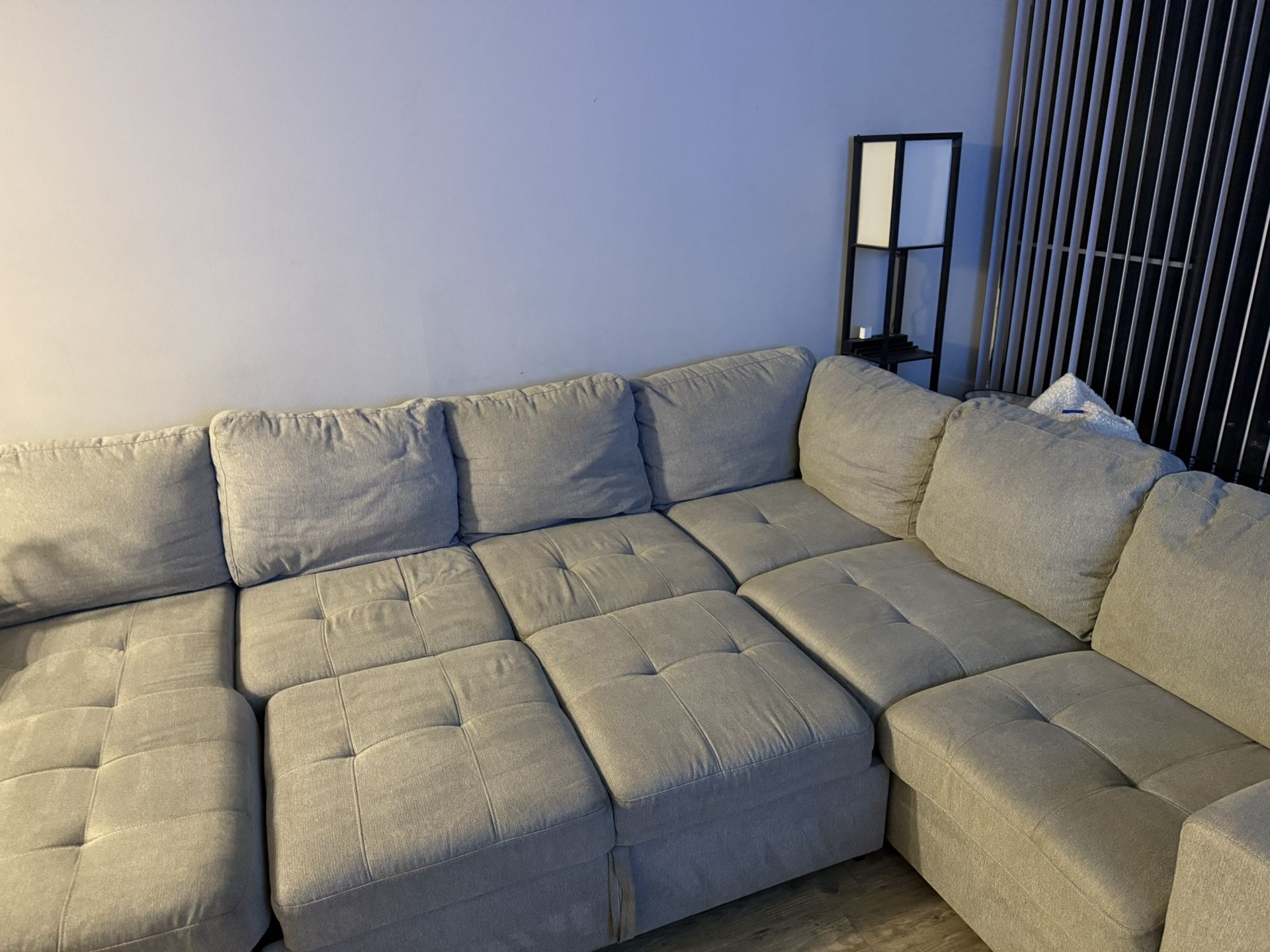 From Rooms to go . no rips or tears , freshly shampooed and cleaned . has storage and sleeper pull out . great condition.