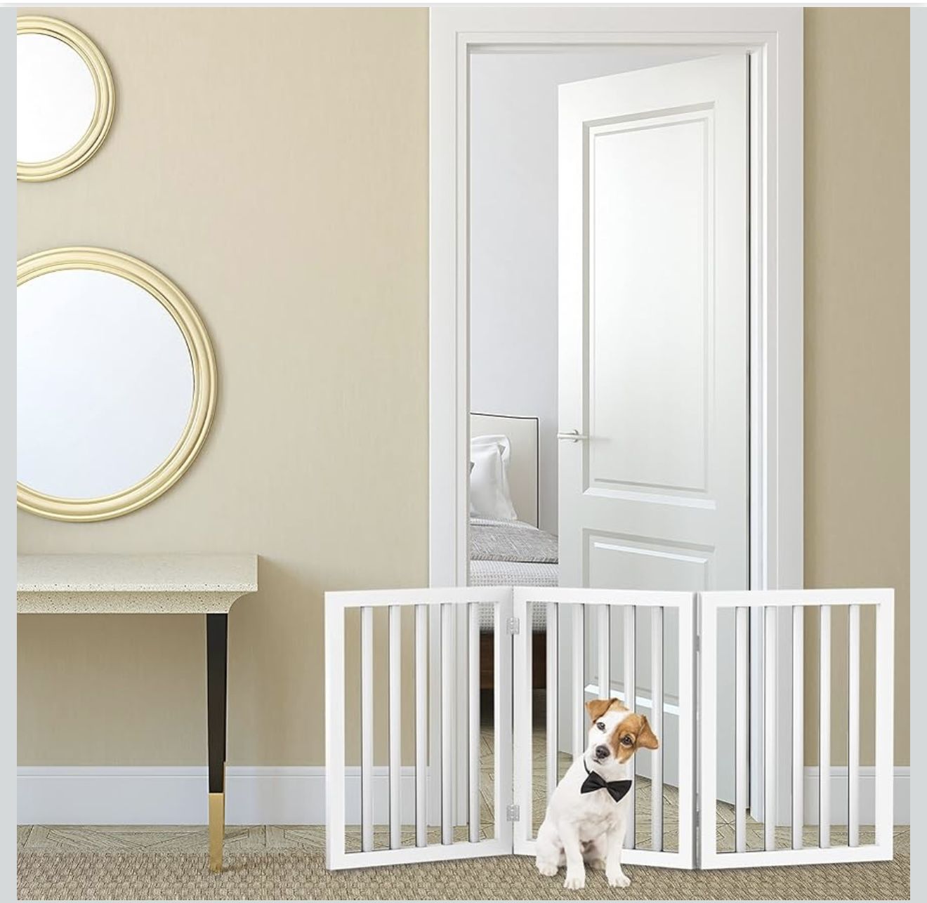 INDOOR DOG FENCE - This 23.75-inch tall dog gate is an excellent way to limit your pet’s access to certain parts of the house, while maintaining a modern appearance. The white finish on this MDF stair gate is sure to complement any home décor. FREESTANDING - Unlike traditional pet gates, this pet fence does not require installation that could potentially damage your home. With an accordion design, this puppy gate is sturdy enough to barricade your small dog, puppy, or kitten, without drilling. FOR STAIRS OR DOORWAYS - This versatile free standing pet gate keeps your pets out of any area of the home you would like to keep them away from, including at the top or bottom of stairways, hallways, doorways, or any openings 33 to 46-inches-wide. FOLDABLE - This essential dog gate for stairs is lightweight and easily folds together for compact storage. When folded, the portable dog fence is small enough to conveniently fit in a closet, under the bed, or take it with you in the car when traveling. PRODUCT DETAILS - Materials: MDF and Plastic. Dimensions: (L) 54.75" x (W) 0.75" x (H) 23.75"; Folded: (L) 18.25" x (W) 2.25" x (H) 23.75". Recommended for Openings Measuring 33”-46” Wide. Door Gates for Pets Only. Color: White.