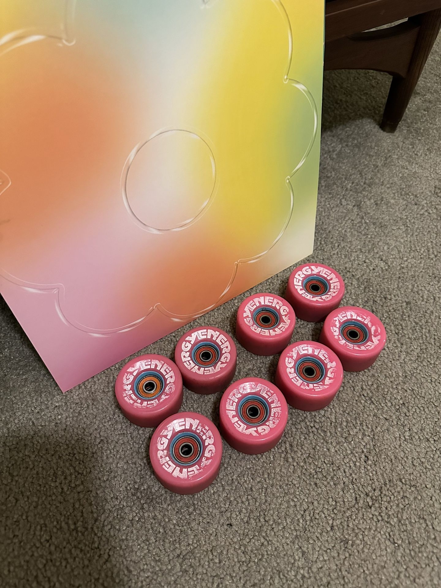 Pink radar energy wheels 57mm 78a (small but soft) all the bearings except on one wheel spin nicely