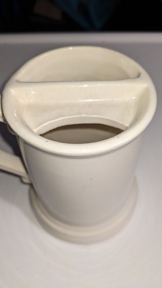 * This unique and rare mug is in great shape with no cracks or chips. Never been used - displayed in collection through the years. Note pictures for more details. * Made in Roseville, Ohio by McCoy Pottery * Vintage from the 1960's * Measures approx. 5.25" tall x 3.25" in diameter * Cream color with glossy finish * Mug could be used as a shaving or drinking mug Historical Relevance - Moustache Cups gained prominence during the second half of the 19th century. They were designed for the moustached man, a fashionable facial feature of the day. The inner shelf across the top edge prevented one's moustache from becoming soiled with coffee, chocolate, or tea.
