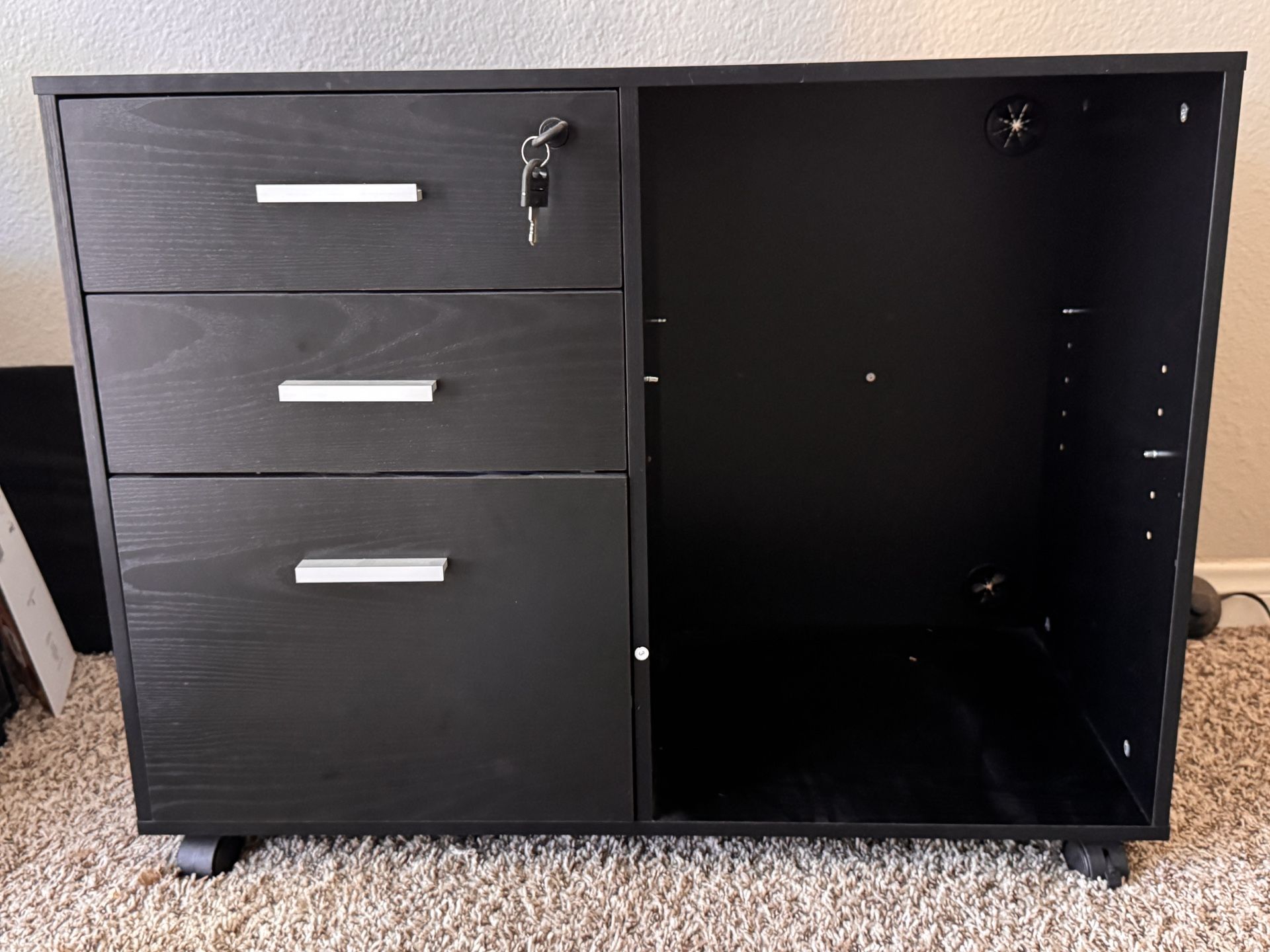 3-Drawer Wood File Cabinet with Lock, Mobile Lateral Filing Cabinet, Printer Stand with Open Storage Shelves for Home Office, Black