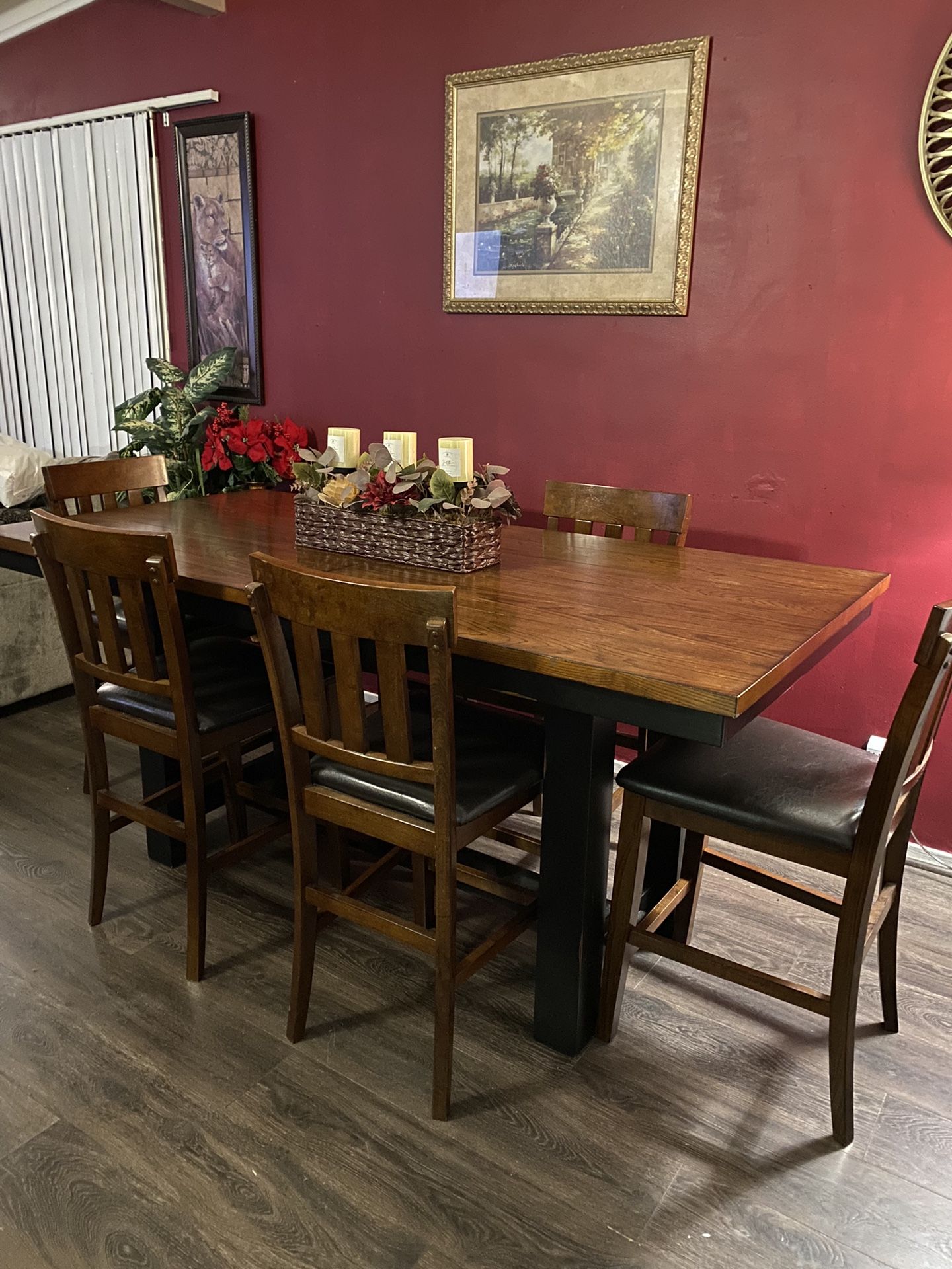Great condition, comes with 6 chairs all same great condition as the one in the picture. Also, comes with extensive leaf (Not in the picture) 78” long without leaf, depth 38”, height 36”. With leaf table is 98” long.
