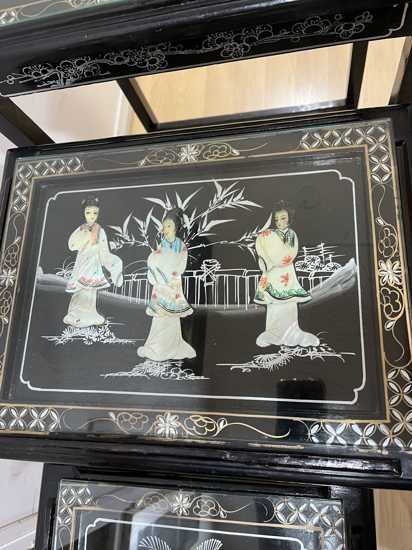Black laquered Glass Top. Measurements are 20” L x 14” W x 27” Tall. Solid wood.