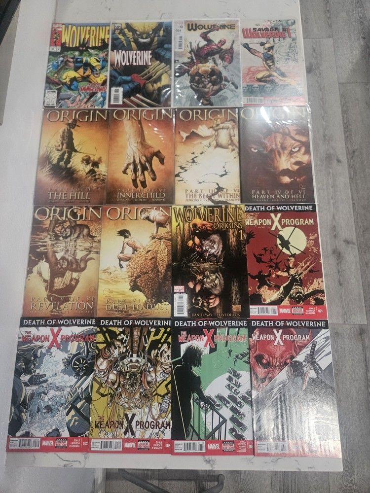 All comics are priced individually. Bulk deal for all 27 comic books $120 total. Wolverine #69 Vol2 1993 $3 Wolverine Vol3 #36c 2006 Joe Quesada Variant Cover $5 Wolverine Vol7 #21b 2022 Ryan Stegman Variant Cover, vs Deadpool Cover $5 Savage Wolverine #1 2013 $4 Ultimate Wolverine #1 2025 $6 Wolverine Origin #1 2001 1st Dog Logan, Wolverine Family $10 Wolverine Origin #2 2001 1st time uses claws, Death of Thomas Logan (Father?) $6 Wolverine Origin #3 2002 $6 Wolverine Origin #4 2002 $5 Wolverine Origin #5 2002 $5 Wolverine Origin #6 2002 $5 Wolverine Origins #1A 2006 1st Muramasa Blade, Nuke app $6 Ultimate Wolverine vs Hulk #1 2006 $7 Wolverine Bloodlust #1 1990 2nd print $2 X Deaths of Wolverine #1 2022 Adam Kubert Cover Art $5 Death of Wolverine Weapon X Program #1 2015 $4 Death of Wolverine Weapon X Program #2 2015 $4 Death of Wolverine Weapon X Program #3 2015 $4 Death of Wolverine Weapon X Program #4 2015 $4 Death of Wolverine Weapon X Program #5 2015 $4 Hellverine #2 2025 Panosian Variant $10 Sabretooth #1 1993 Die Cut cover $3 Return Of The Living Deadpool #2 2015 $6 Deadpool Vol3 #2 2016 $14 Iron Man #12 2021 Rahzzah Miles Morales 10th Anniversary Cover $6 Captain America #(contact info removed) Newsstand, 1st app Demolition Man $5 Alpha Flight Vol1 #13 1984 Classic Wolverine Cover $5 I have other listings for sale. Willing to trade for other comic books, vinyl records, weights, vintage video games, Jordans, anything related to the Marvel characters Venom, wrenches, ratchets, socket