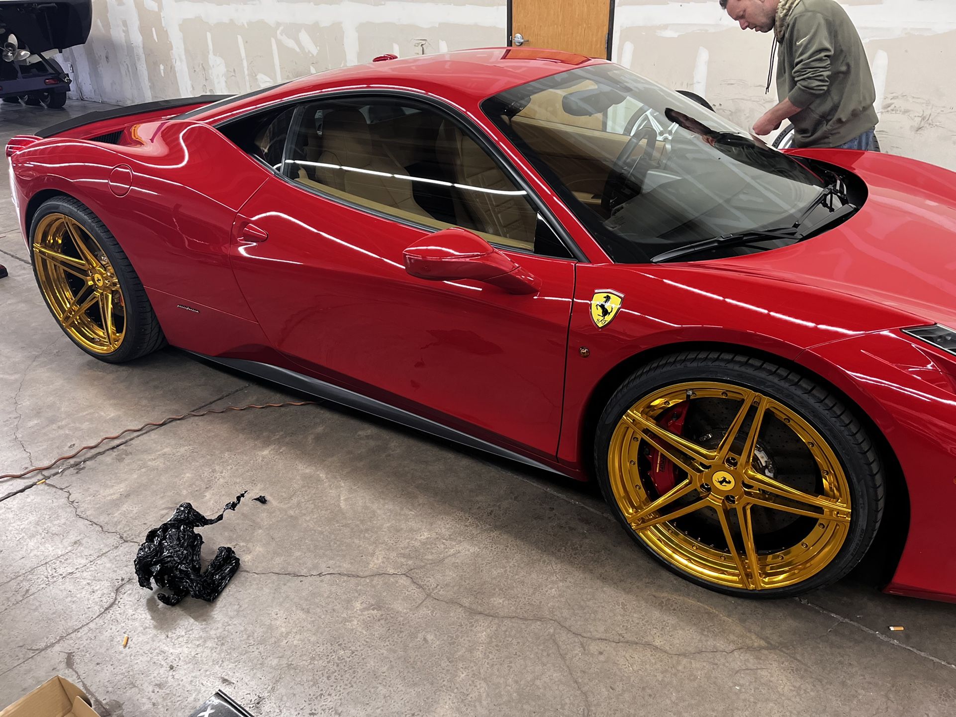 Custom 3 piece wheels 21x9 22x12.5 made for Ferrari 458 Ferrari 488 and will fit Ferrari f8 brand new Pirelli 335/25/22 and 255/30/21 8/32 tred come mounted with TPMS NO CURB RASH NO BENDS. I can have the color changed for 1000 to anything you want