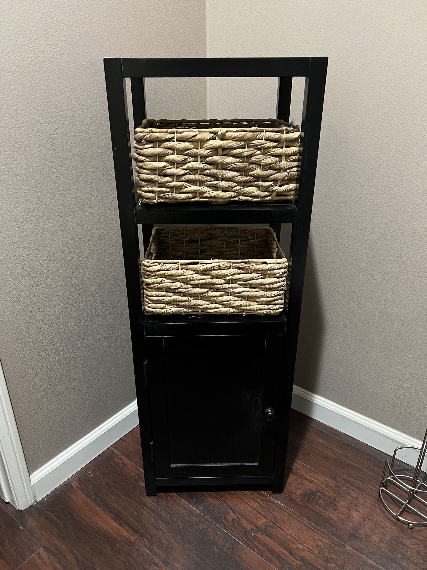 Black cabinet with 2 baskets and the bottom door opens for more storage with 2 shelf spaces in good condition Measures at 42 1/2 tall x 15 wide Pick up only