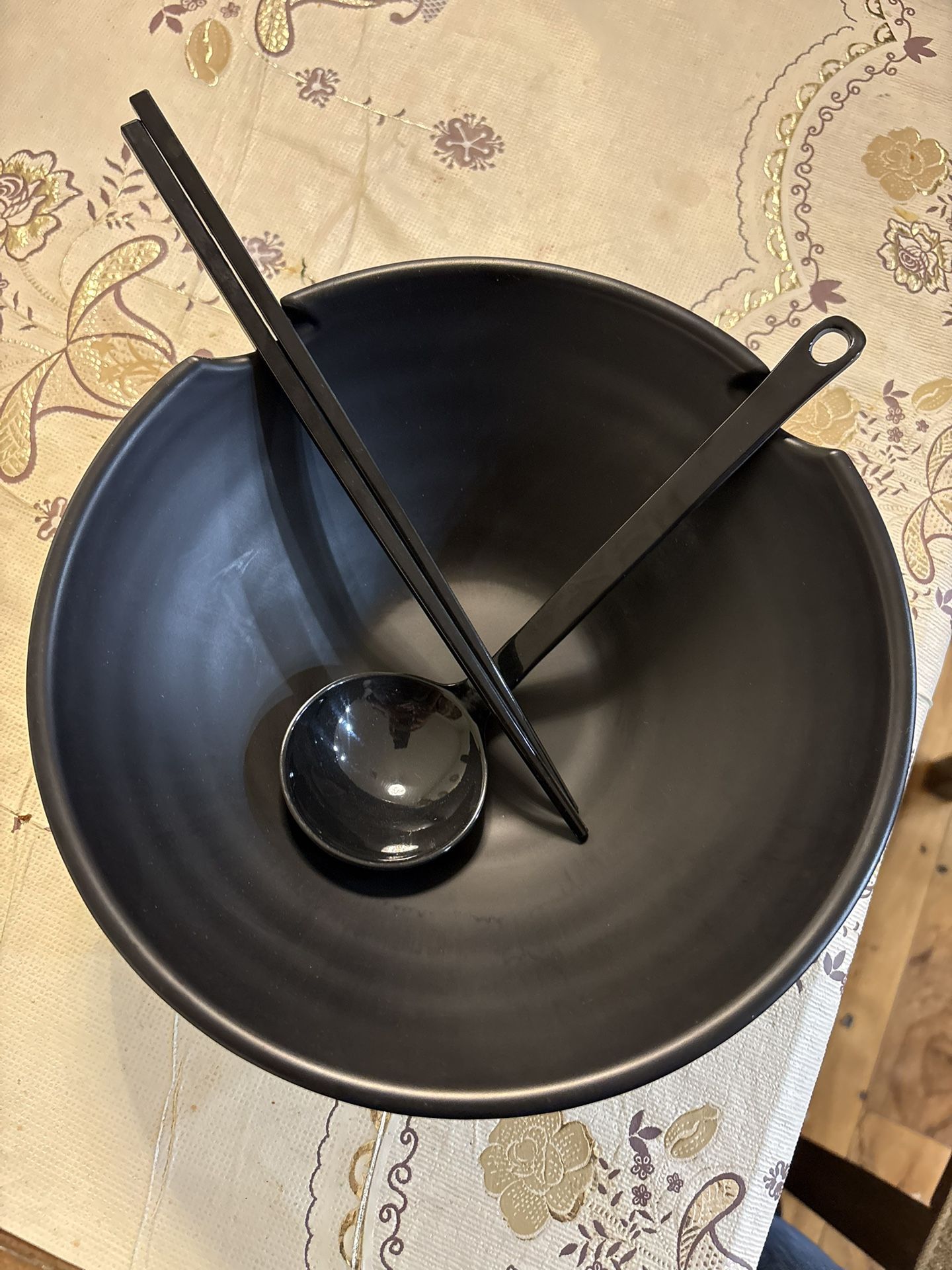 The sets come with the bowl itself, chopsticks, and a soup spoon. Measurements: • 9 inch diameter • 3 inch height