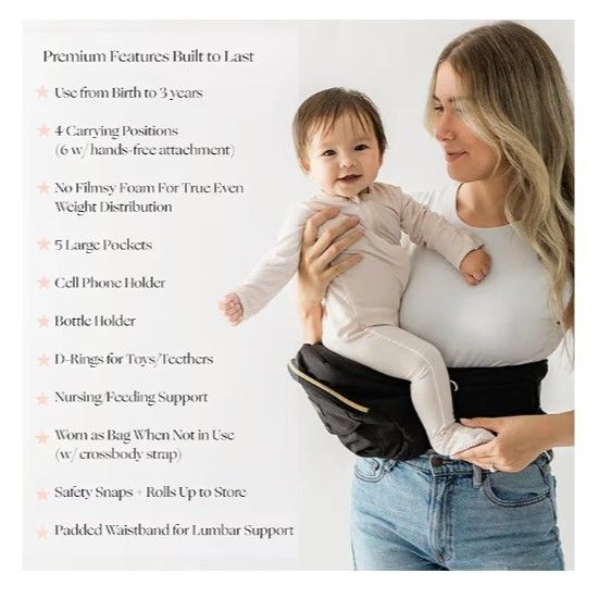 Tushbaby Original Hip Seat Baby Carrier for Babies & Toddlers up to 45 lbs, Safety Certified, Lightweight No-Foam Design with Storage & Nursing Support, Black & Gold Like New. Come get it before it's gone