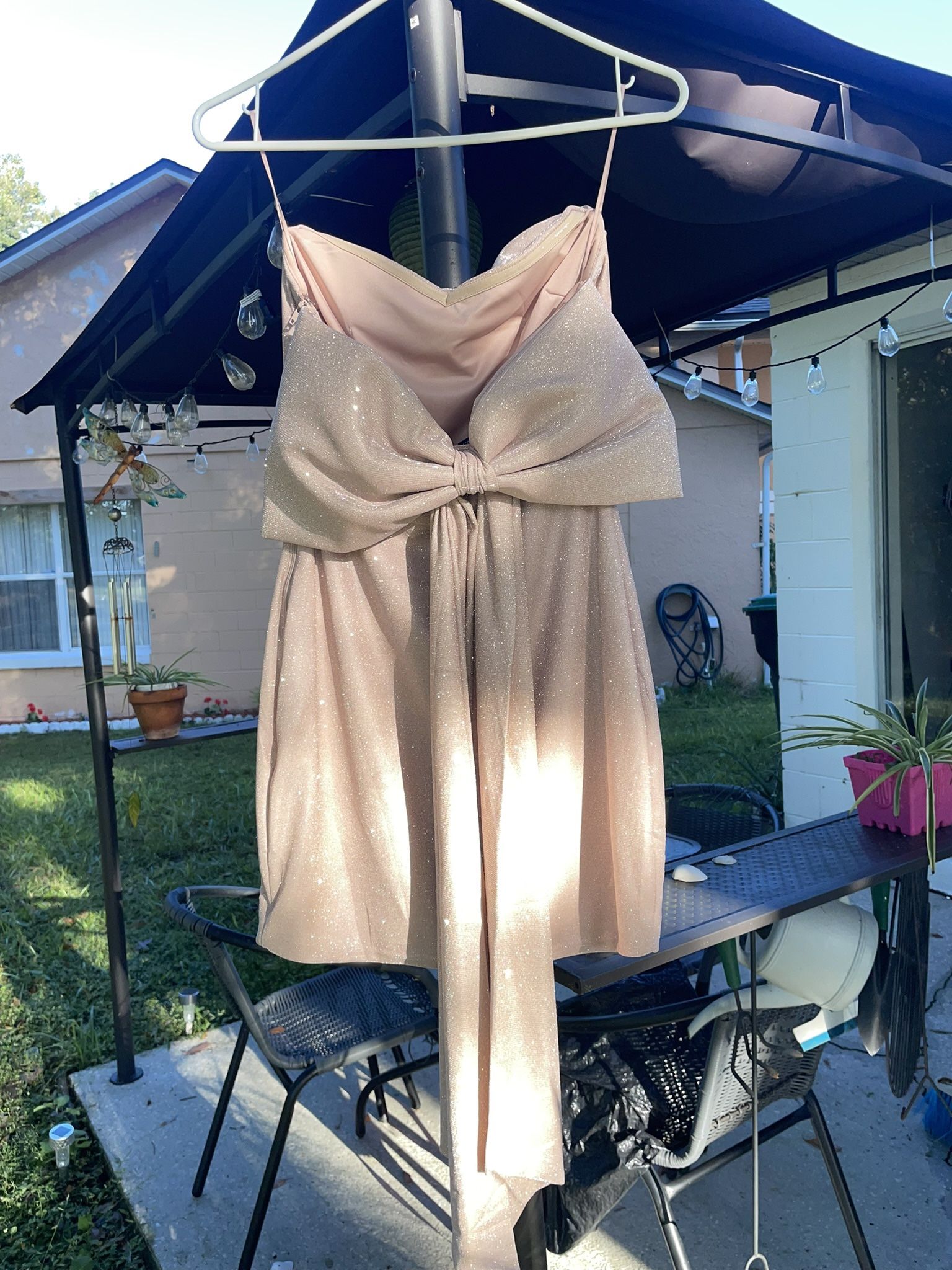 Homecoming dress. Blush, pink sparkly homecoming dress or other. Light pink with sparkles with a cute big bow on the back. Strapless size medium only worn one time.