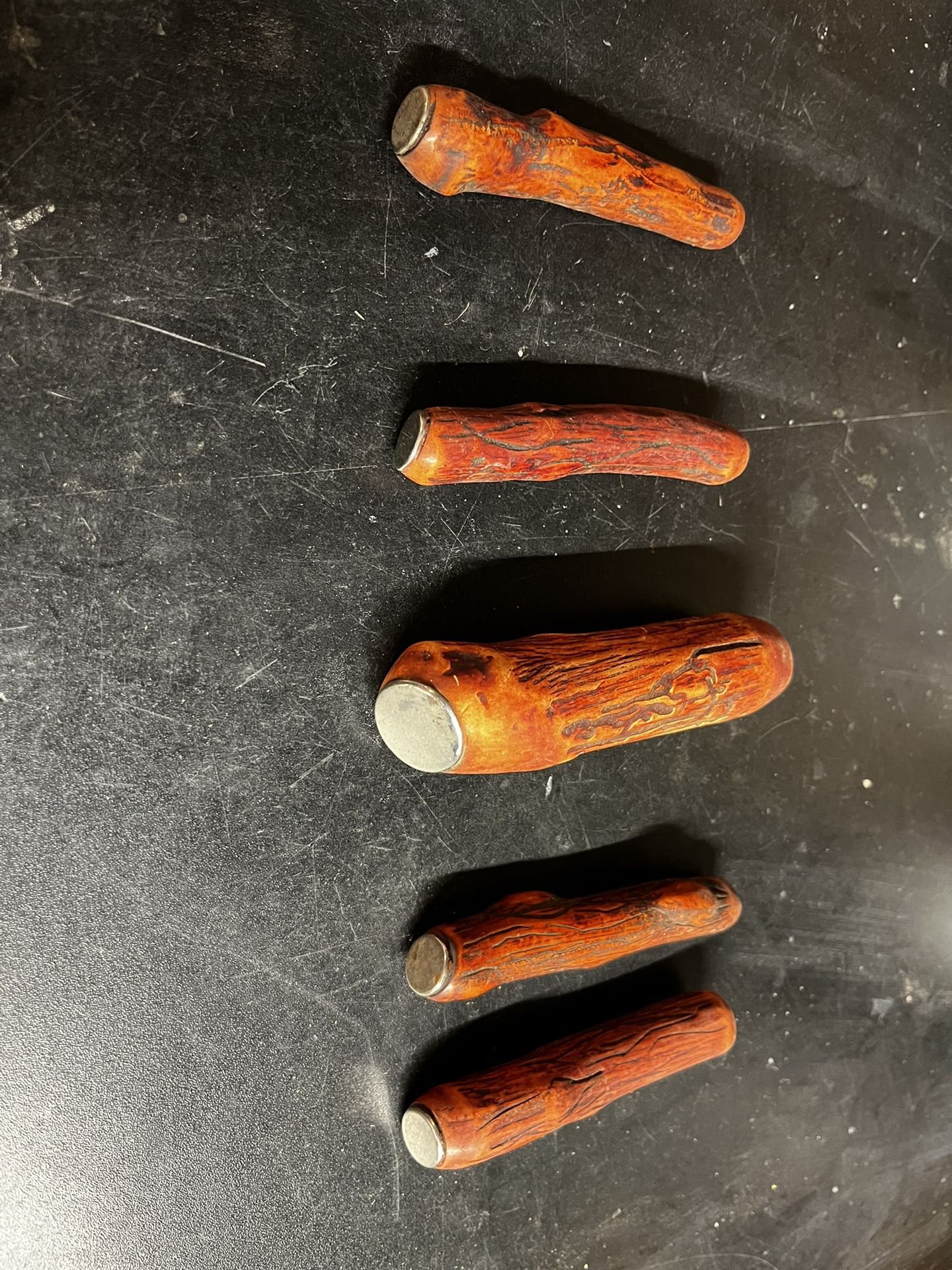 Four at 3 3/4" long, 1/2" diameter Predrilled 3/16" hole for knife blade. One at 4" long, 1" diameter Predrilled 7/32" hole for knife blade. 5 total in lot. Installed metal on butt end.