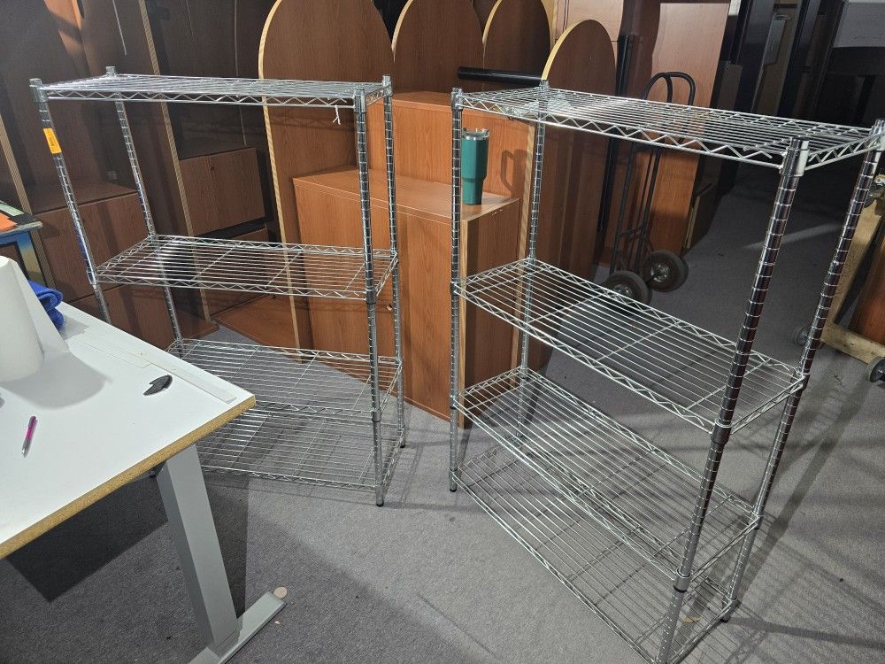 We have two of these wire racks available for $95 each. These commercial racks measure at 36"W x 14"D x 54.75"H. The racks are made of steel with a chrome finish to them. Each unit has a total of four shelves that can be adjusted depending on how much space you need between each one. The racks are in really good condition with very little cosmetic wear to it. You can set these up in your garage at home or at the office warehouse. Recycled Furniture here in Irving has these and several other types of shelving units to look at. Feel free to contact us for more info.