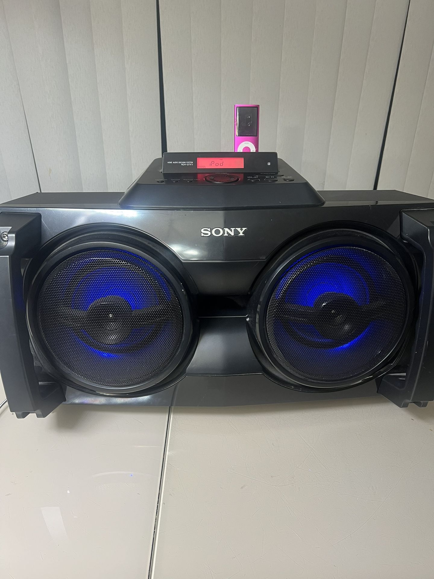 Sony Boombox 220W Model RDH-GTK1i Great Shape no Remote None Bluetooth . Used in very good condition with minor cosmetic blemishes. These blemishes are in the form of light scratches and scuff marks. The unit has been tested and is fully functional and comes with the aux cord and antenna No remote. This is a great sounding speaker and the speaker has two light mode, red and blue. Please note iPod is for testing purposes only and not included in the sale.