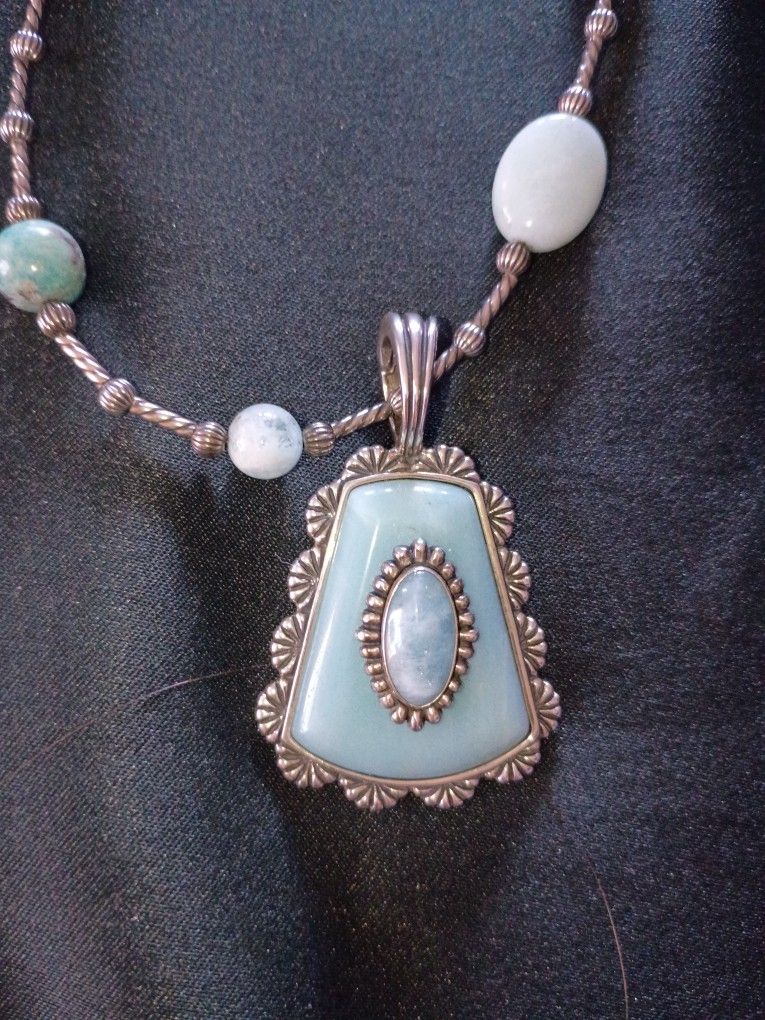 Sterling silver chain and pendant . Pendant has a separate clasp that locks in for easy removal from necklace. Amazonite aquamarine beads. Comes with matching earrings.