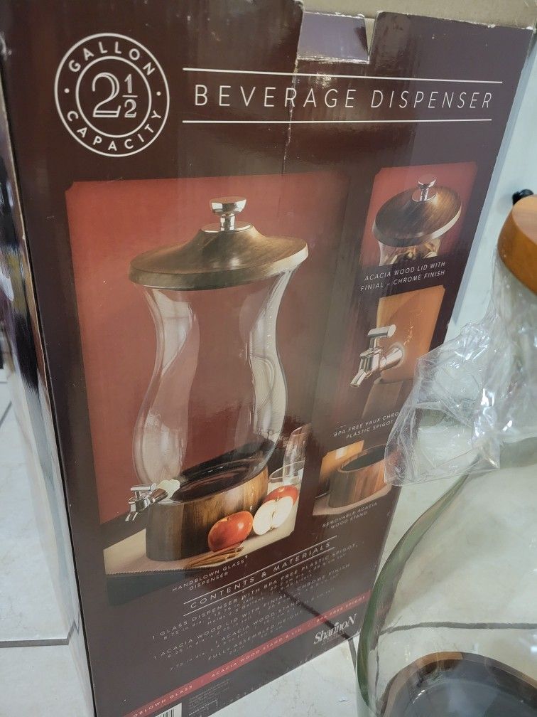 Acacia wood and handblown glass beverage dispenser, wood lid with chrome finish, wood base, 2.5 Gallon capacity.