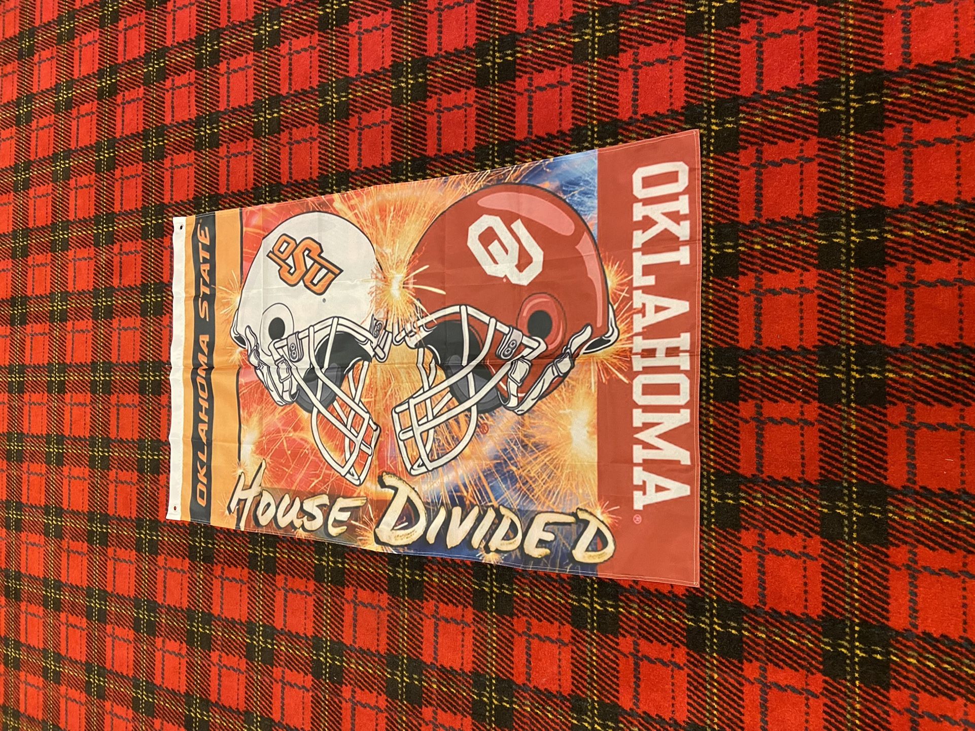 Brand new 3 foot by 5 foot. You can hang it up inside or outside. Would make a great addition to any man cave. Oklahoma Sooners flag Oklahoma State Cowboys flag