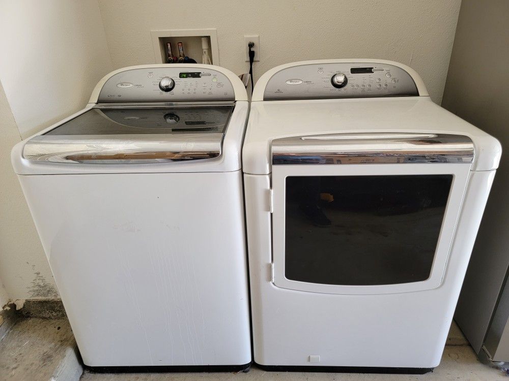 Huge Capacity!!! Whirlpool Cabrio Platinum Series Matching Set with Gas Dryer with Steam!!! Must See To Appreciate!!! Excellent Condition!!! They Both Work Perfectly!!! Options Galore!!! Glass Top!!! Huge, 4.6 Cubic Ft. Capacity Washer!!! Offers Room For 3 Baskets of Laundry in a Single Load, Yet Handles Small Loads Very Efficiently!!! Very Oversized, Stainless Steel Tub!!! ***ENERGY STAR*** Ultra Low Electricity Usage. Saves You Money Every Month On Your Electric Bill!!! This Washer Has 4 Different Temperature Settings: *Hot *Warm *Cool *Cold It Has 4 Soil Level Settings: **Heavy **Normal **Medium **Light Spin Speeds Options: ***High ***Medium ***Low This Washer Has 13 Cycles To Choose From: ***Normal ***Casual ***Bulky Items ***Heavy Duty ***Clean Care ***Whites ***Soak ***Active Wear ***Sheets ***Clean Washer with Affresh ***Delicates ***Quick Wash ***Rinse/Drain and Spin It Has Separate Settings For: **Extra Rinse **Fabric Softener **Eco Boost End Of Cycle Signal Great For a Large Family!!! Easily Cleans Large Blankets!!! Matching, Whirlpool Cabrio (Platinum Series) Gas Dryer with Steam!!! Huge, 7.6 Cubic Ft. Capacity, Drum!!! Easily Drys Those Large Blankets and Comforters!!! Has 11 Great Drying Cycles! Steam Cycle (Enhanced Touch Up!) See Through Dryer Door Window!!! Has 5 Temperature Settings!!! *Air Only *Extra Low *Low *Medium *High Has Sanitize! Has Quick Dry! Has Wrinkle Shield!!! Has EcoBoost!!! Has Damp Dry Signal!!! Must See To Appreciate!!! It Runs Super Smooth and Quiet!!! Must See To Appreciate!!! Delivery (Local) $35.00 - $45.00 (Longer Distances is Higher).