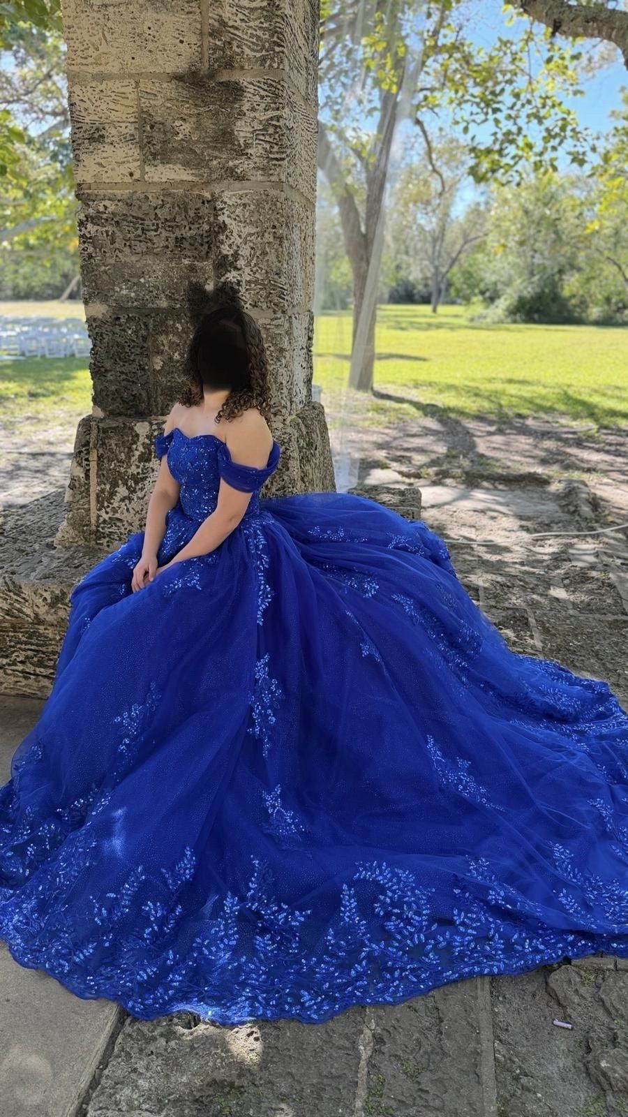 It’s a royal blue dress with sparkling sequins, perfect for both day and night. Its elegance and shine will make you stand out on your big day, blending classic style with a modern touch. Plus, it’s adjustable to fit you perfectly—ready to make your quinceañera a radiant dream!