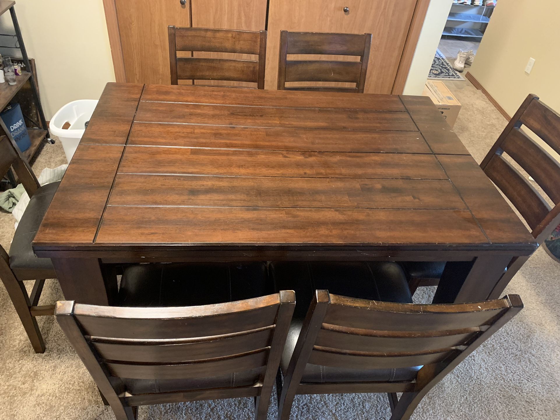 Extendable Wood Kitchen Table *Table Dimensions: 36in wide, 54in long, 36in tall, opens and extends to 54in x 54in *Chair Dimensions: chair seats: 23in tall chair width: 19in x 17.5in full chair: 41n5in tall *One broken cushion (pictured)* Can be fixed, just didn’t have the right tools to fix.