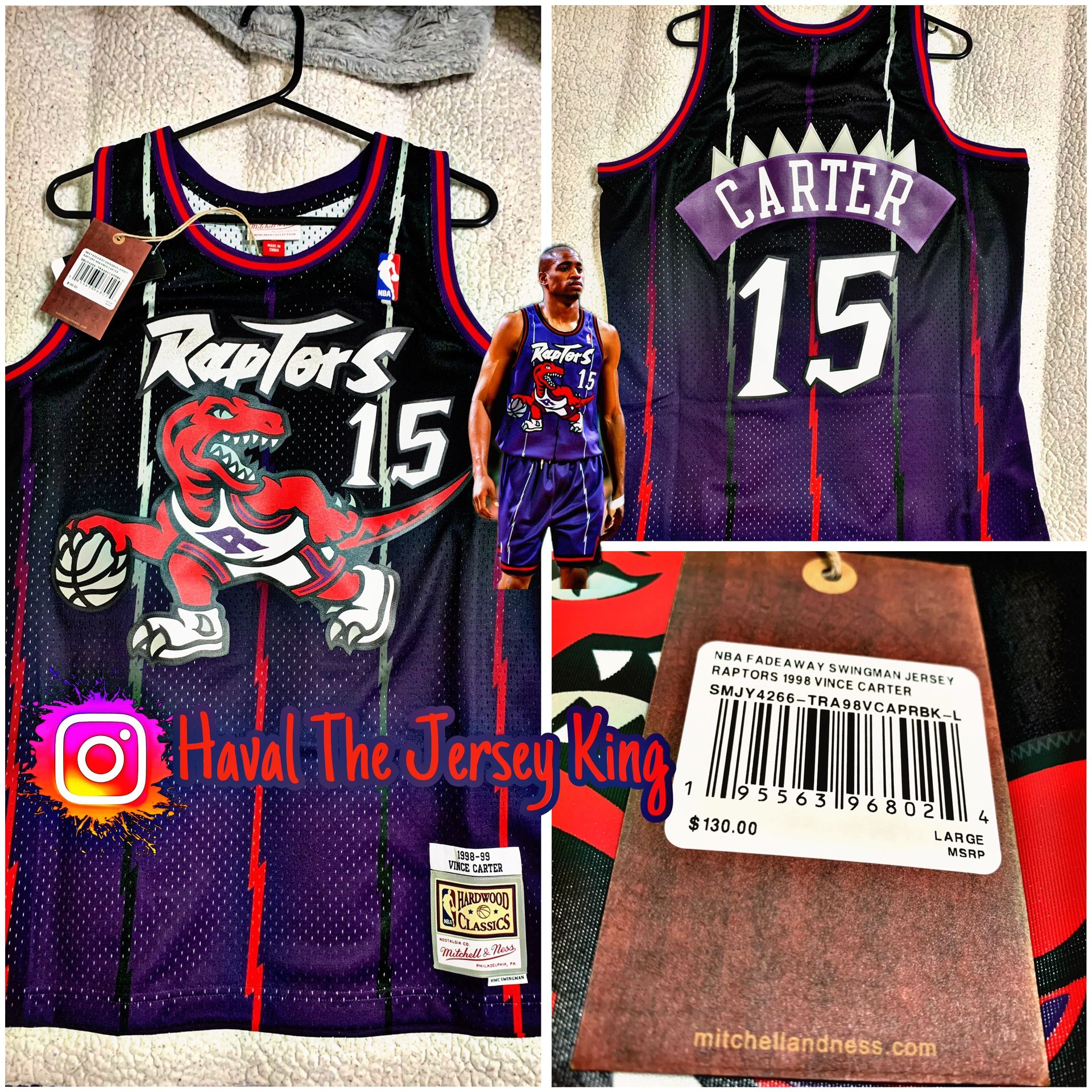 Sport a little throwback spirit in this Vince Carter Toronto Raptors 1998-99 Hardwood Classics Swingman jersey from Mitchell & Ness Droptail Jock tag Side splits at hem Heat sealed printed twill graphics Sizing Tip: Product runs small. We recommend ordering one size larger than you normally wear. Material: 100% Polyester Machine wash, line dry Officially licensed Imported Brand: Mitchell & Ness