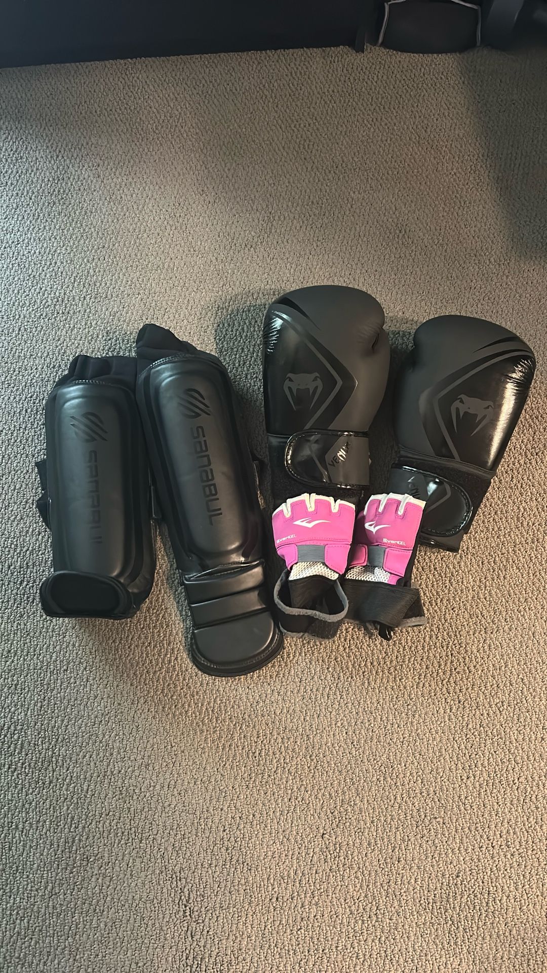 Basically new boxing gloves, shin guards, hand wraps. Sold as pack only.