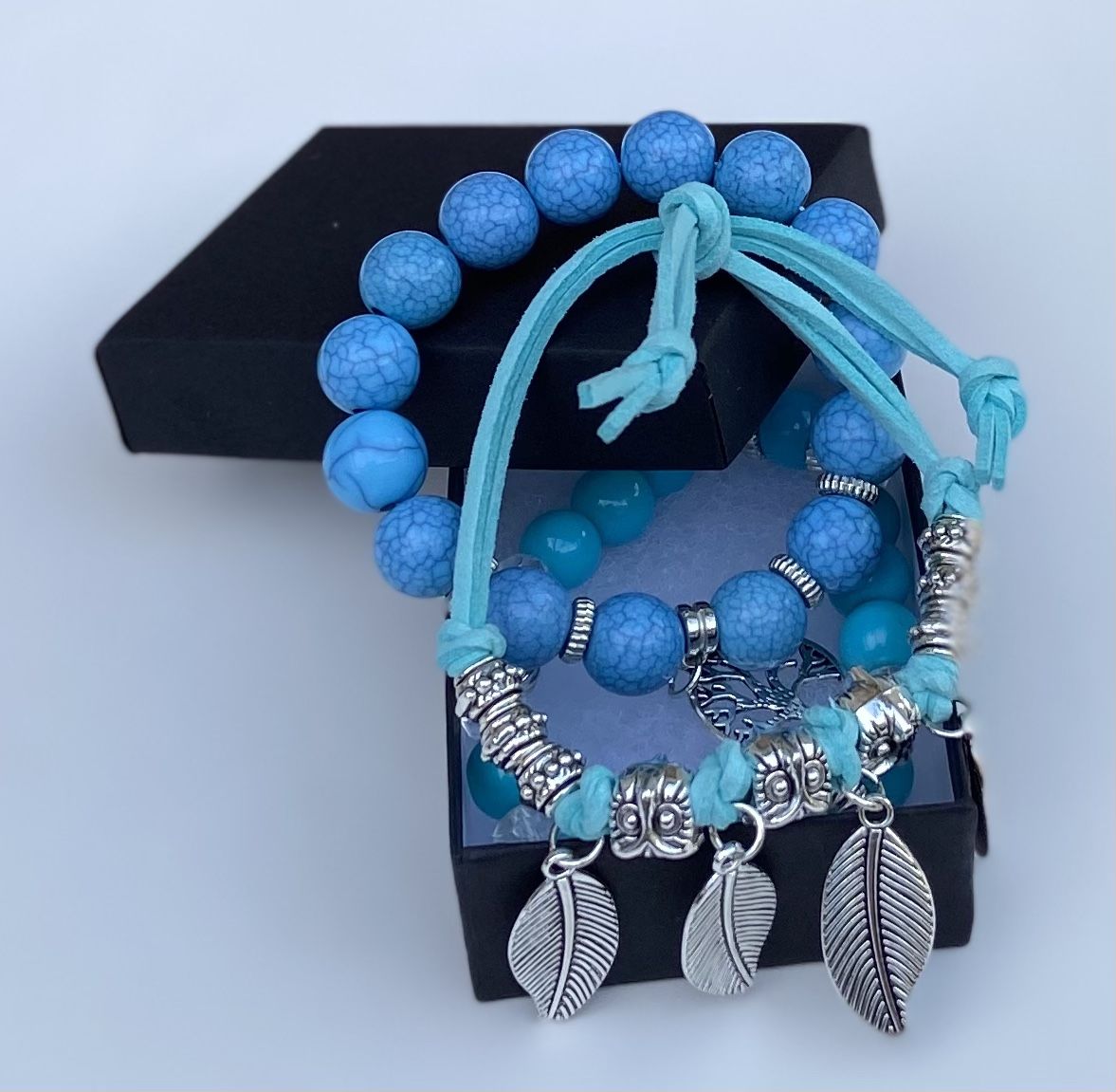 set of 3 elastic bracelets handmade resin beads metal pendants In color blue