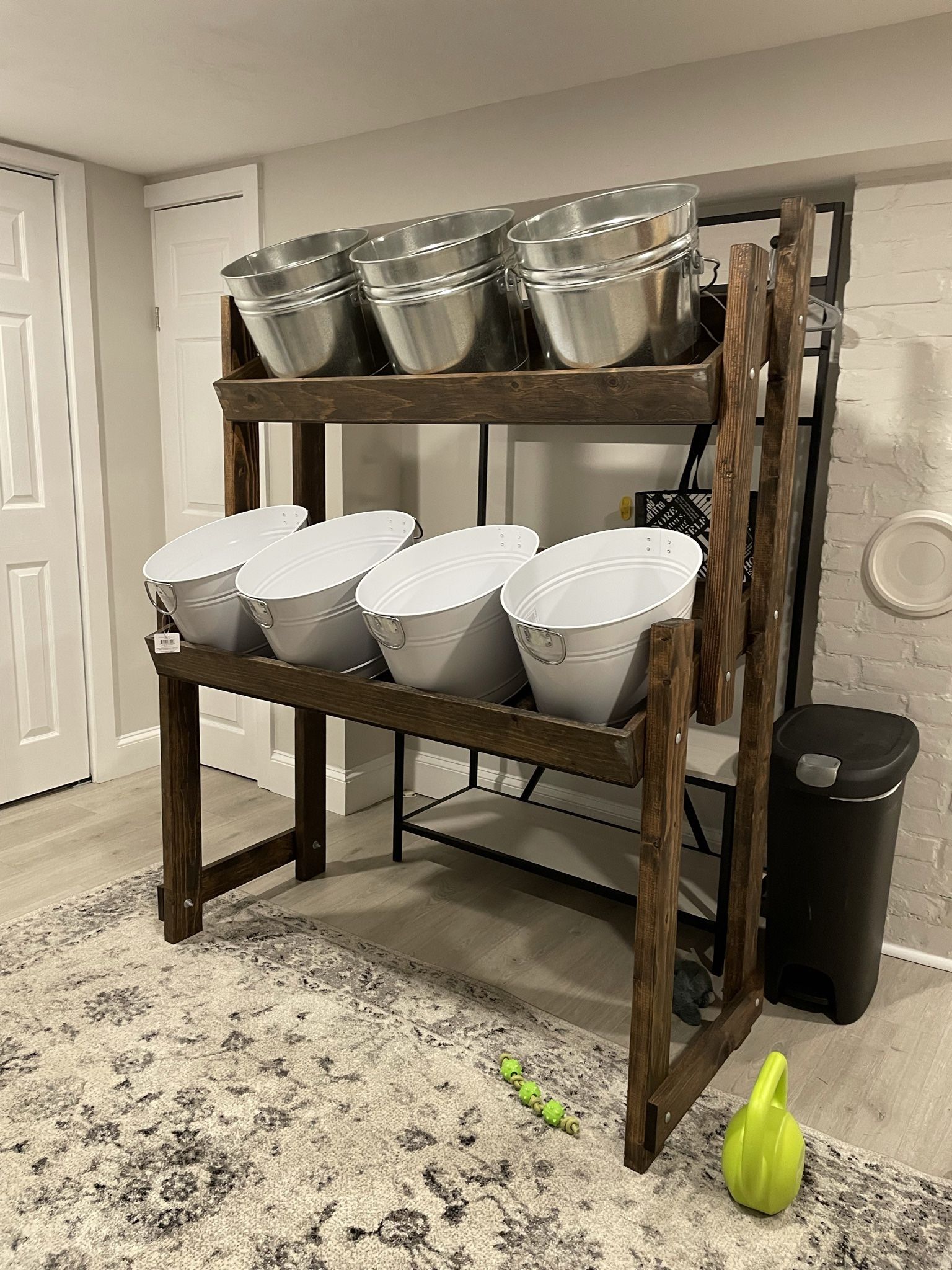 Item was built to hold drink tubs for a wedding. Beautifully built with plenty of thought gone into the item. Can be used for many purposes (ie. flower trays, display shelf for items, etc.) -Made with %100 real wood -Can be taken apart for easy transport or storage. -Stained a beautiful dark walnut. -Does not include drink tubs.