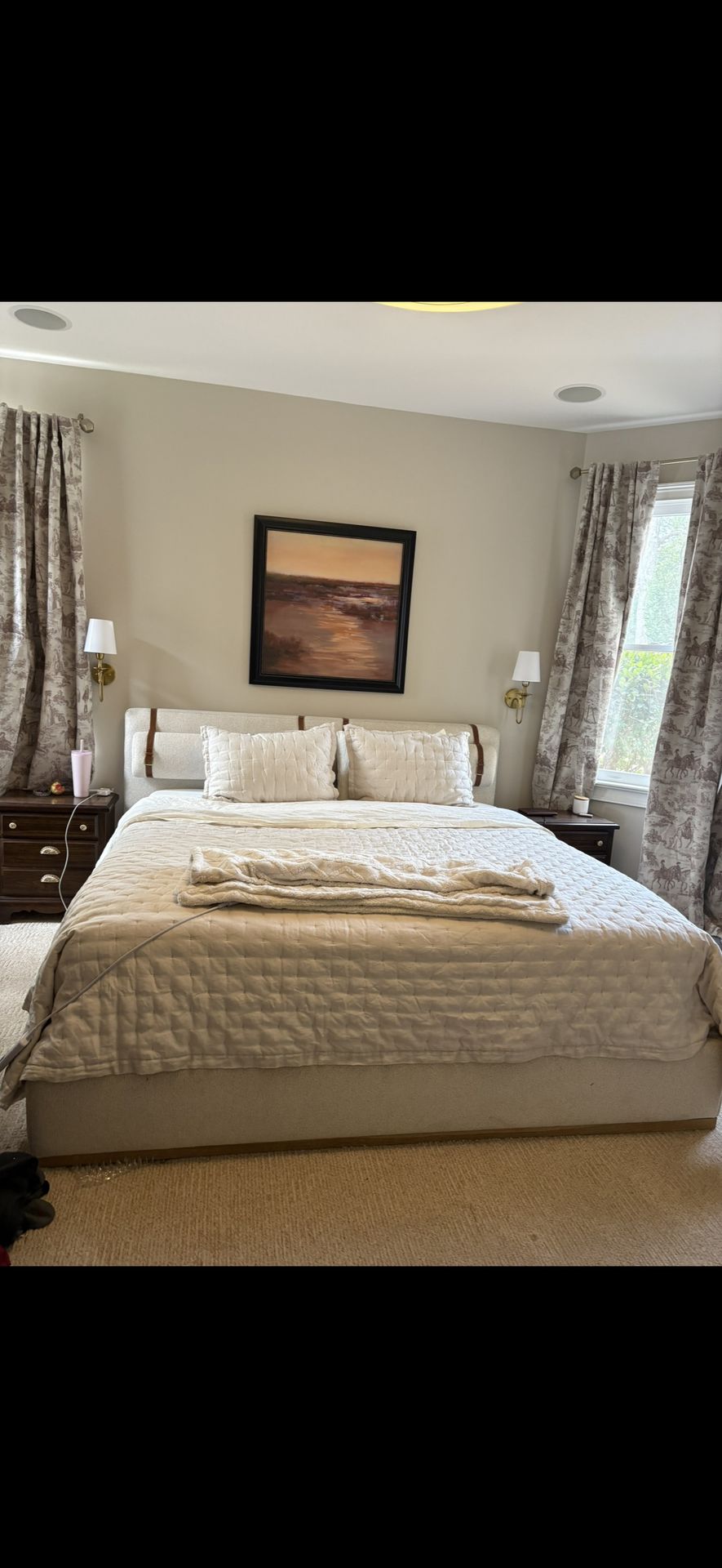 You won’t find a bed like this at this price again! Selling for $500- less a third of what we originally paid. Need to sell NOW! Mid century modern boucle bed. Only used for about a year, we are just changing our aesthetic. Same bed as Bethany Frankel from RHONY! King sized without the attached bedside tables. Just the bed frame- no mattress. Pick up only in downtown Columbia. Will be disassembled for easy loading and unloading. Super cozy and soft. The pillows attached with leather straps are removable to suit your taste preference.