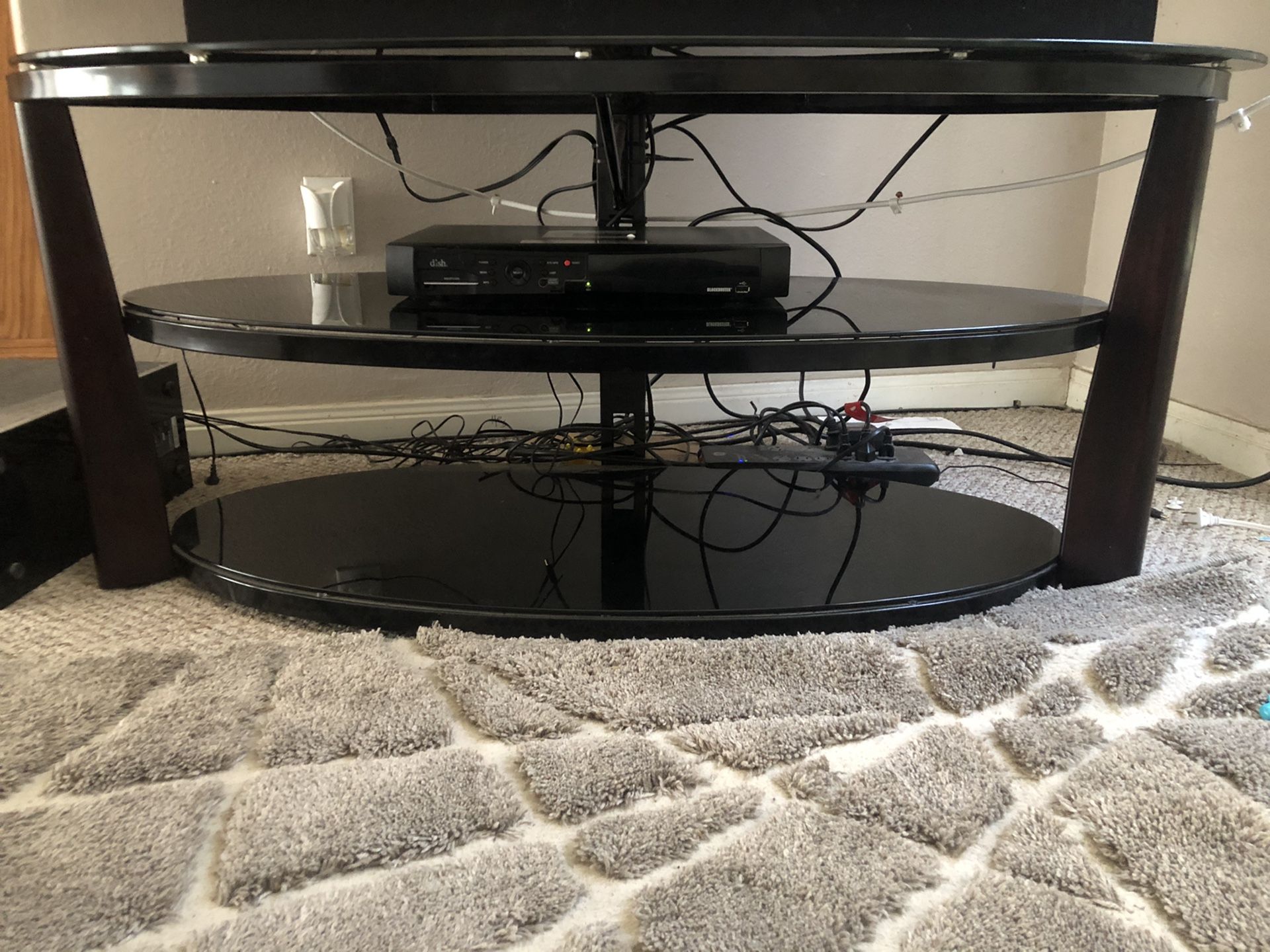 Metal tv stand with 3 glass shelves and wood legs. Holds up to a 75 inch TV. Very sturdy. Has access to route cords behind it. 43 inches long X 21 1/2 inches tall