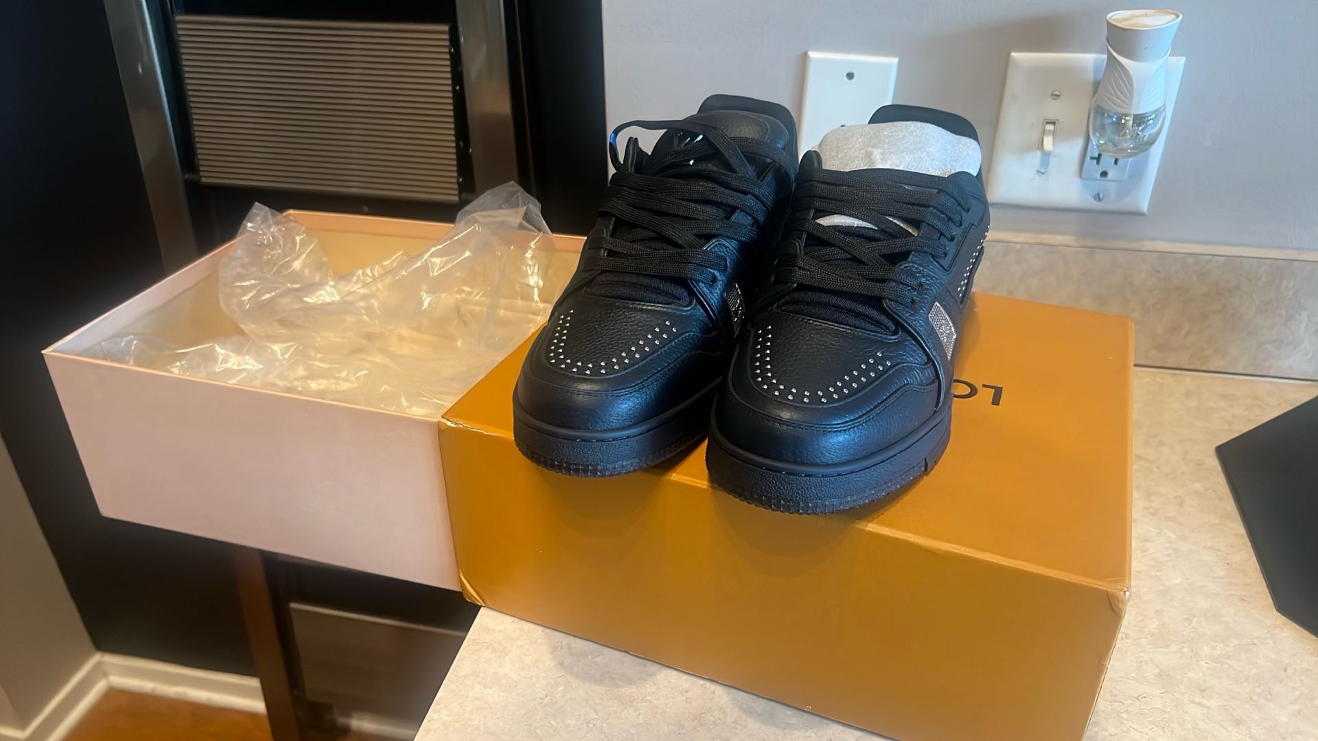 Short Bullet-Point Description Brand: Louis Vuitton Model: Rivoli High-Top Sneaker Color: Black Details: Crystal-studded LV logo on heel, perforated leather uppers Condition: 100% Brand New – never worn Includes: Original Louis Vuitton box + packaging Made in Italy – luxury craftsmanship