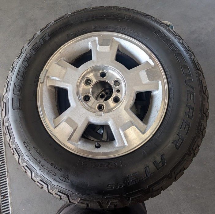 Ford F-150 wheels and tires up for grabs tires are in great conditions about 80% tread left they are cooper tires 245/70/R17. Tires alone are worth more. I'm not sure what year F150 the wheels themselves are from but came with my old F150, which was a 2017. I put new tires on them about a year ago. The wheels are missing the center caps, but they are in great shape.