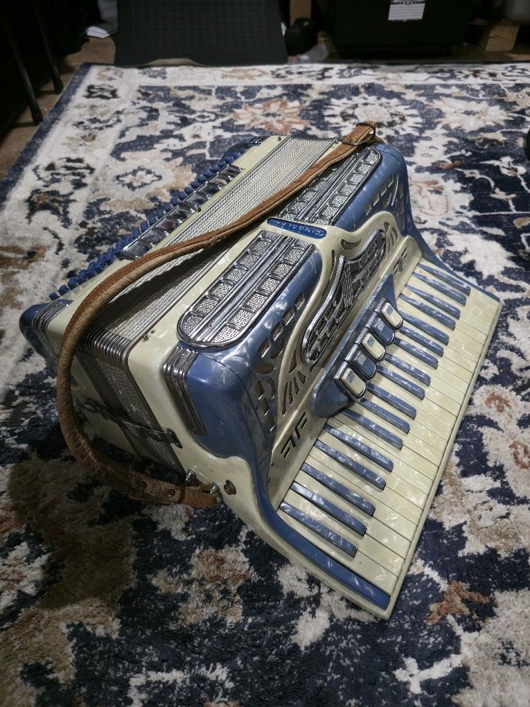 For Sale is a Powder Blue Cingolani Piano Accordion with straps. I've had this in storage for over 20years and never played it. I had thought about taking lessons when I first got it, but gave up on the idea.