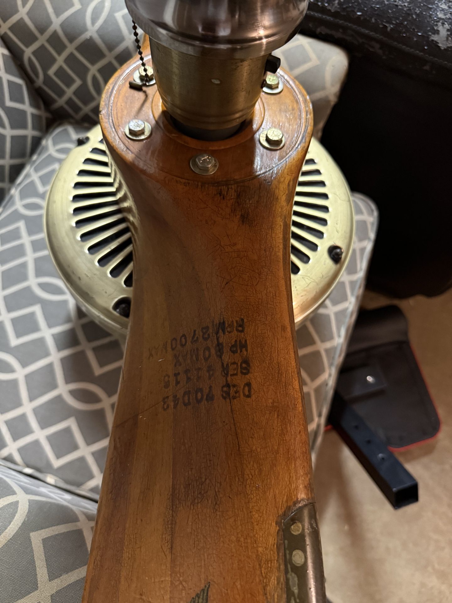 Unique ceiling fan made from a real aircraft propeller blade. This is not a replica — it’s an authentic wooden airplane propeller that has been converted into a working ceiling fan. Great piece for aviation enthusiasts, hangars, man caves, aviation themed bars, or unique home decor. Details • Authentic wooden aircraft propeller blade • Aviation logo stamped into the wood (SBC marking) • Heavy duty brass ceiling fan motor • Real wood construction • One of a kind aviation decor piece Condition: Good overall condition. See photos. This is a rare decorative piece and a great conversation starter.