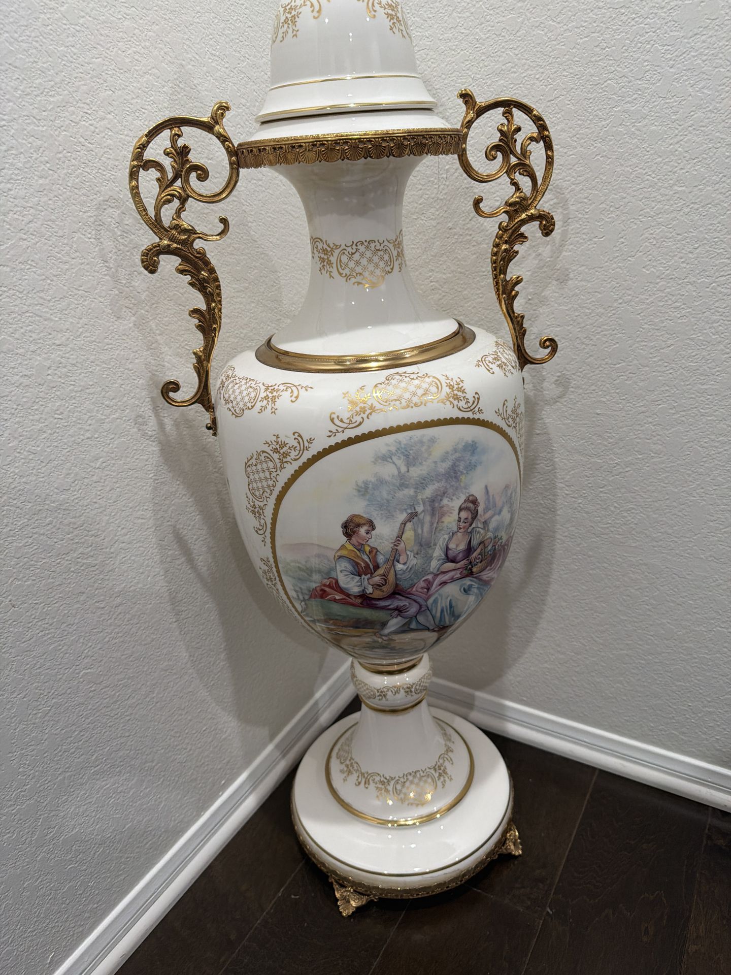 Elegant large vintage porcelain urn-style lamp featuring a classic French romantic courting scene. This piece has a beautiful hand-painted look with a musician and seated woman in a pastoral setting, framed by ornate gold detailing throughout. The lamp is designed in a traditional European style with highly decorative gold-tone ormolu-style handles, a matching lid/finial top, and a wide pedestal base. The white porcelain body is accented with intricate gilded patterns, giving it a luxurious and timeless appearance-perfect for classic, vintage, or high-end interior