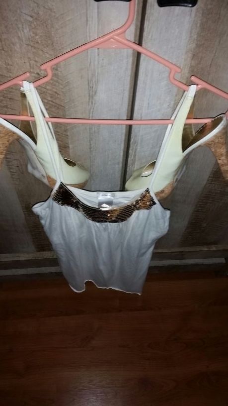Nine-and-a-half Jessica Simpson heels and size small shelf bra tank from Old Navy