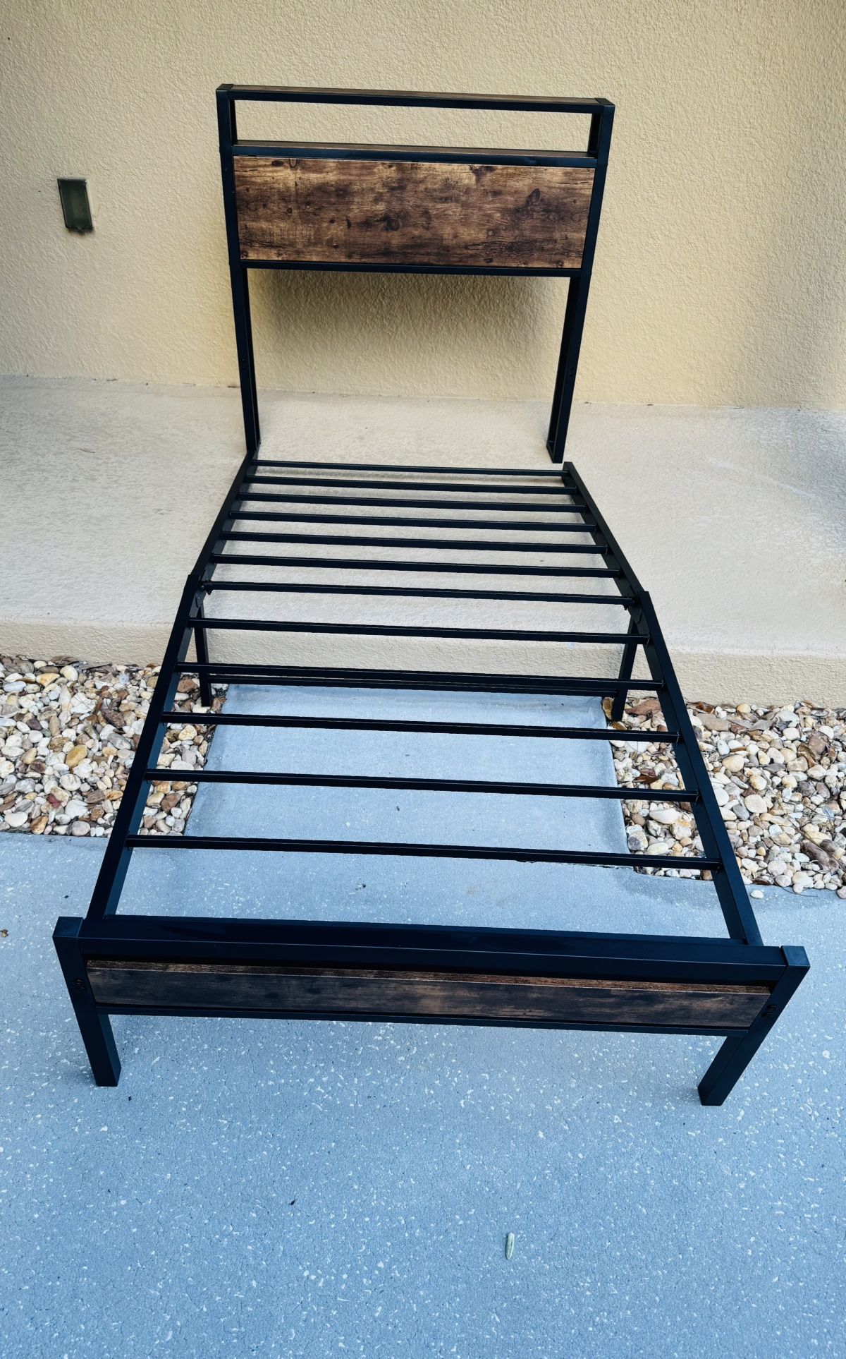 NEW Twin Bed Frame w/ Storage Headboard Instructions & Hardware Included to Attach Headboard $75 The headboard and frame are currently in two pieces. The frame folds in half to move. The hardware and instructions are included to attach the frame to the headboard. There is a tiny dent on the metal on the headboard of one. It is hardly noticeable. This item is new. It has never been used. No holds unless I have an agreement with you of when you will be picking it up with an eta the same day. Cash Only. Must have exact change. We may sometimes be able to deliver to a different location, but will ask for a delivery fee if it is anywhere aside from our designated pick up location. We are not able to offer shipping.