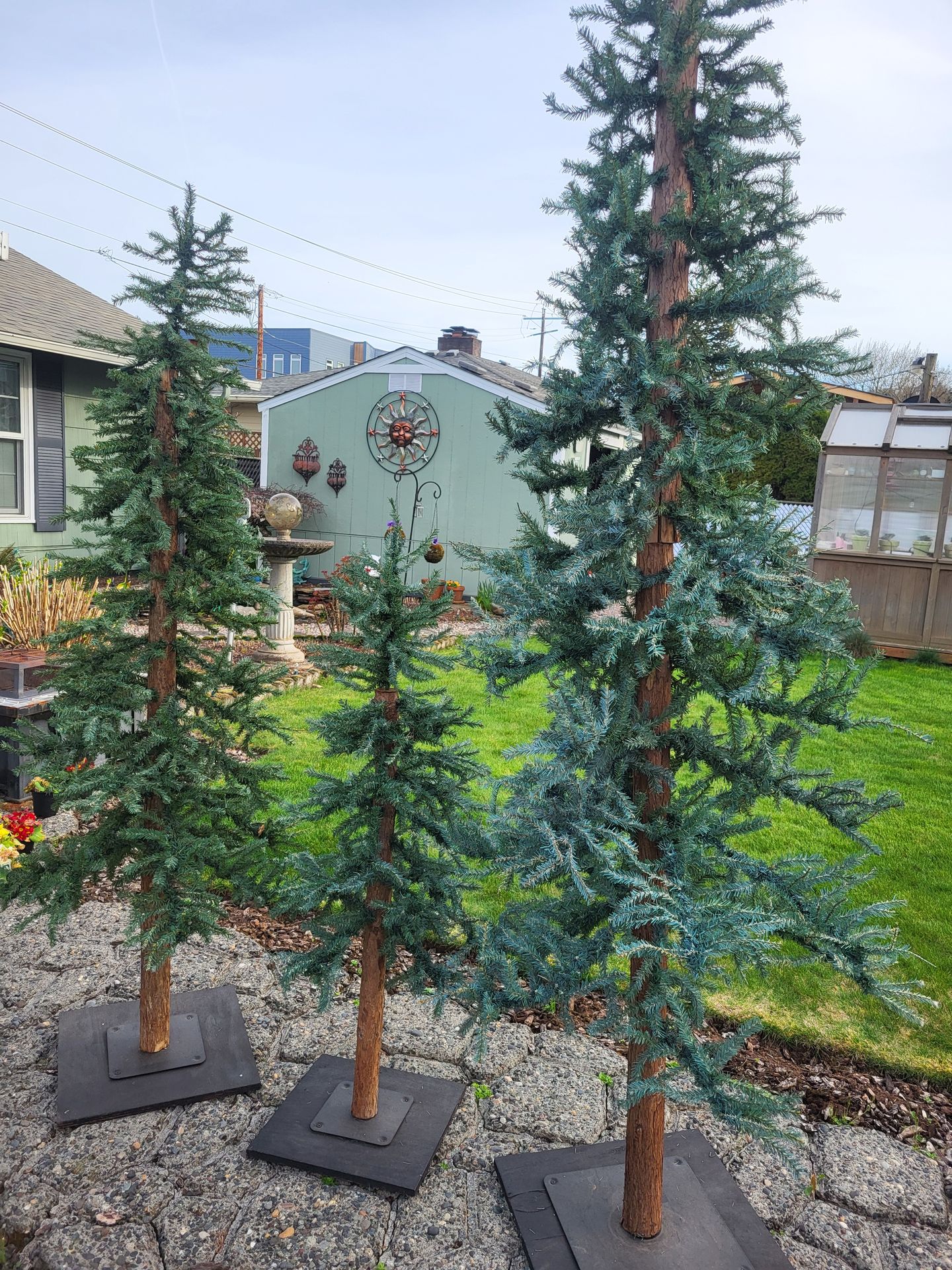 There are 3 fake first trees. 4ft, 6ft & 8ft We did add new wood on bottom to make trees more stable. Big tree is wobbly though! All in good shape besides that.