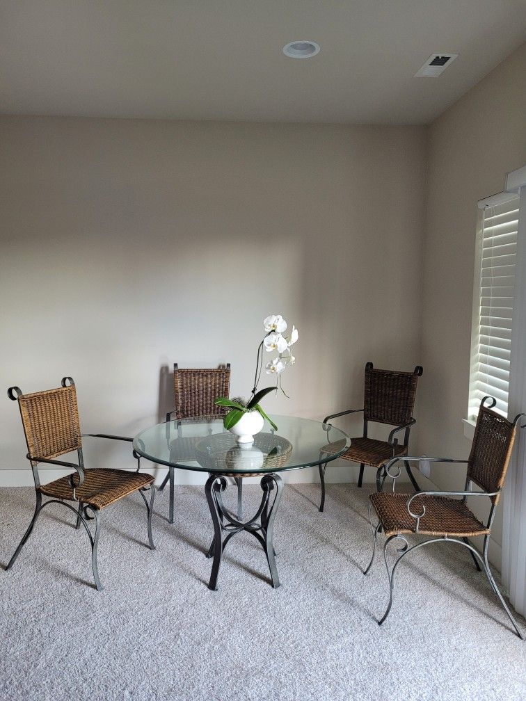 Glass table and metal chairs very well quality. Nice set that will last you a long time. Dimensions table: D 114 cm H 75 cm Used only inside the house. This set can be used indoors and outdoors. Pick up Bothell/Mill Creek