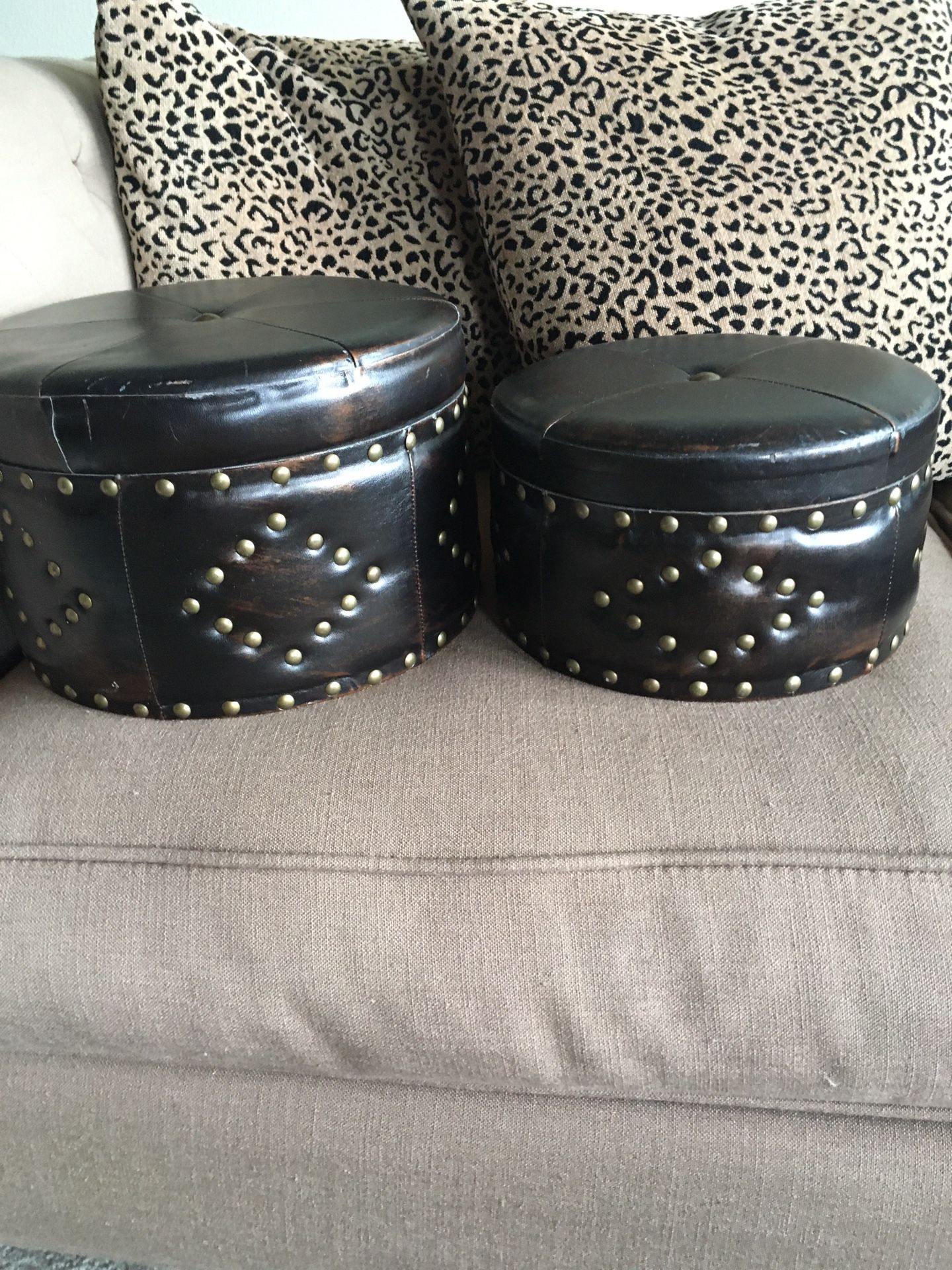 This set of 2 stunning leather-like storage boxes have a wooden interior and impressive antique brass stud detailing. The large one measures 9” in diameter The smaller one measures 7” in diameter.
