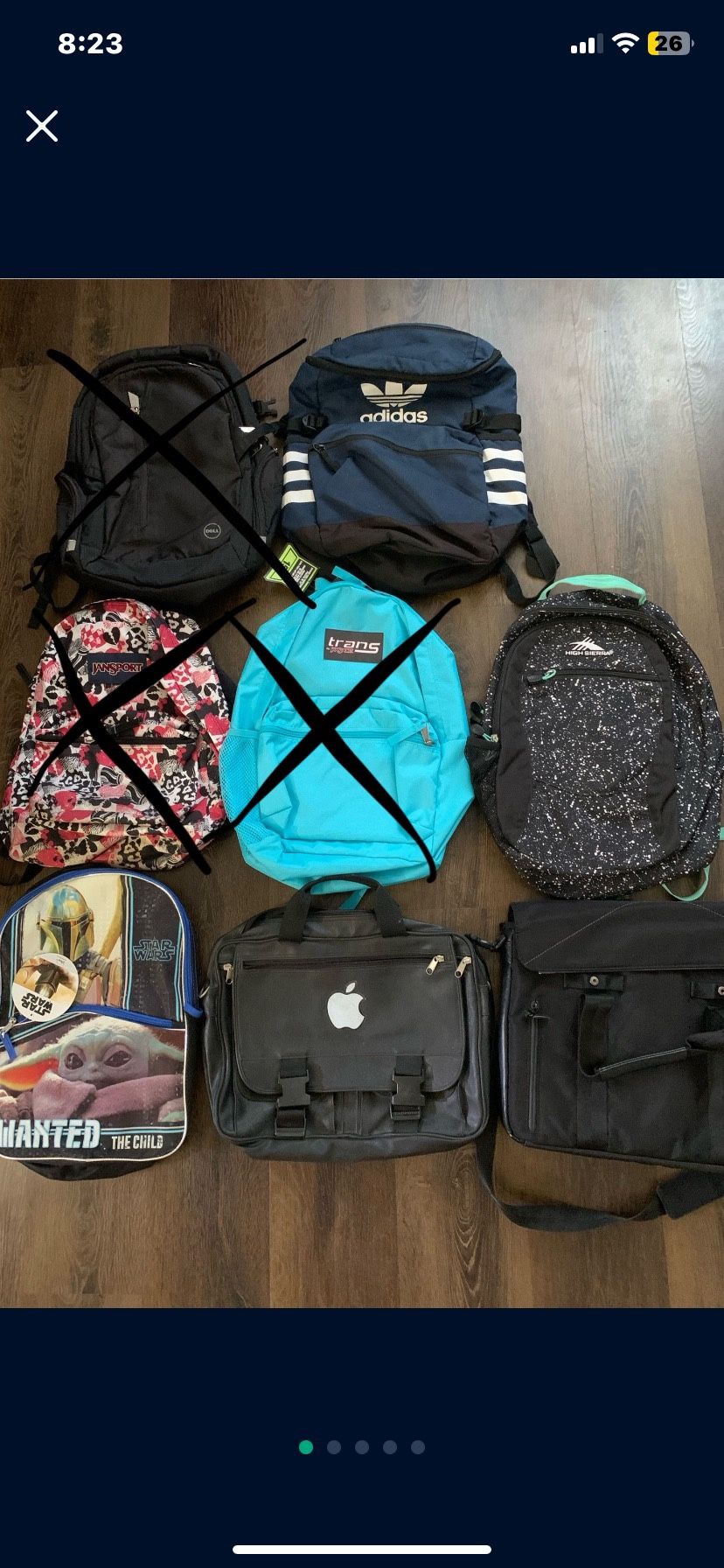 Bags are new to used condition , baby yoda is new with tag , blue Trans by Jansport is new with tag brown purse is by Antonio Melani multi colored Jan sport needs a little cleaning on bottom part otherwise good. asking $10 each Silverado ranch area no delivery
