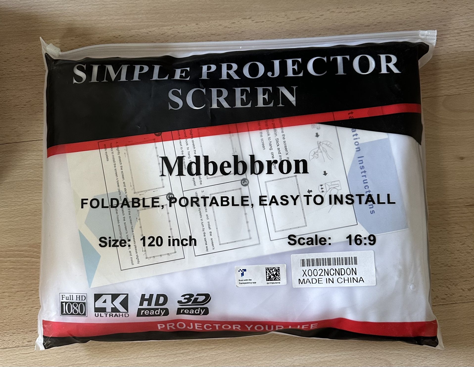 Mdbebbron simple and foldable projection screen 120". Easy to install 16:9 scale Full HD 1080 HD/3D Ready New on bag, never used Includes all instructions and hardware Available in South San Jose