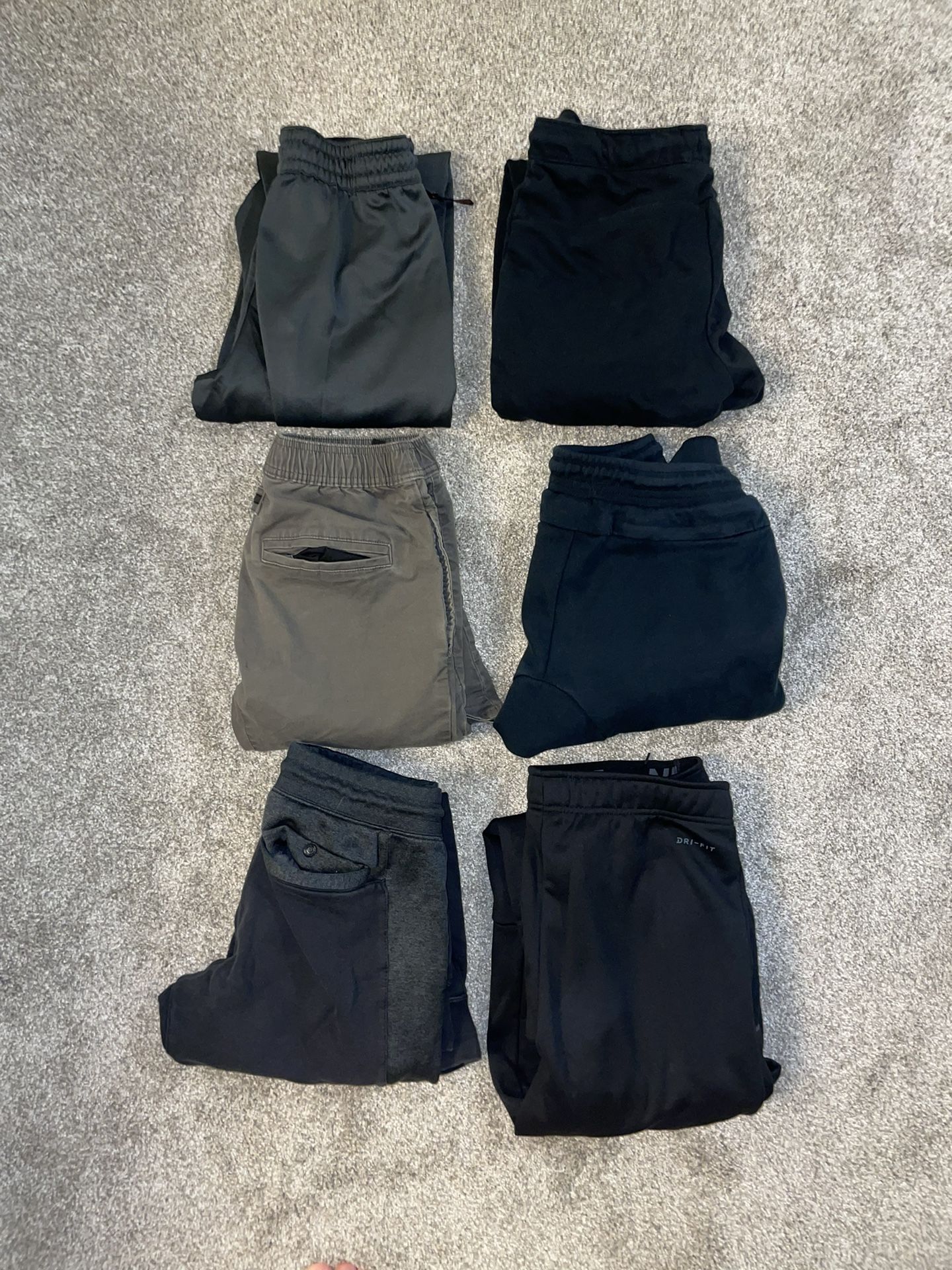 Open to offers Feel free to ask for more pictures Sizes: Nike gray thermal sweatpants: Small Puma black sweatpants: Medium Zanerobe gray joggers: 32 Nike basketball sweatpants: Medium Nike air black sweatpants: Small Nike black dri-fit thermal pants: Small